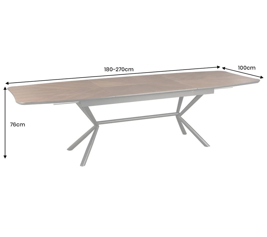 Stůl má obdélníkovou vrchní desku se zaoblenými rohy. Delší strany jsou jemně prohnuté do vnějšího půloblouku, zatímco ty kratší tvaruje zaoblený výřez. S délkou 180 cm poskytne místo k sezení pro šest až osm osob. Vrchní deska je rozdělena na dvě poloviny, které lze od sebe odtáhnout, přičemž se uprostřed vysune dodatečný panel, prodlužující stůl na 270 cm, s kapacitou deset až dvanáct osob.