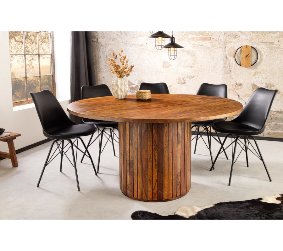 Art deco masivní kulatý jídelní stůl Gire v hnědé barvě s válcovou nohou s lakovaným povrchem 140 cm
