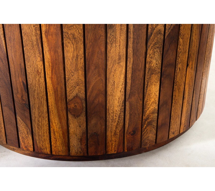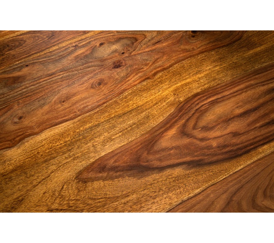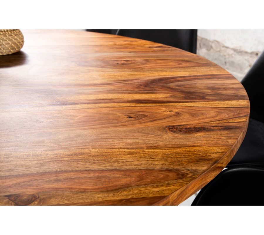 Art deco geometrický kulatý jídelní stůl Gire je výrazný masivní kus nábytku, který spojuje nadčasový design s přirozenou krásou dřeva. Je vyroben z kvalitního sheeshamového dřeva v teplém hnědém odstínu, které vyniká svojí tvrdostí,odolností a jedinečnou kresbou. Stůl je složen z více desek, díky čemuž krásně vyniká výrazná struktura letokruhů a přirozené barevné přechody dřeva, přičemž každý stůl je originál. Povrch je lakován, což zvyšuje jeho odolnost a zároveň zvýrazňuje přirozený charakter materiálu.