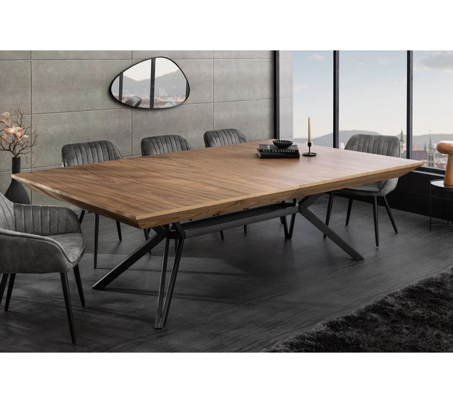 Jídelní stůl Gerant vás okouzlí spojením elegantního vizuálu ořechového dřeva s moderním industriálním prvkem v podobě tmavé kovové podstavy. Oceníte i praktickou rozkládací funkci, díky které je stůl vhodný pro běžné každodenní použití a zároveň poskytne dostatek místa i při větších rodinných setkáních či oslavách.