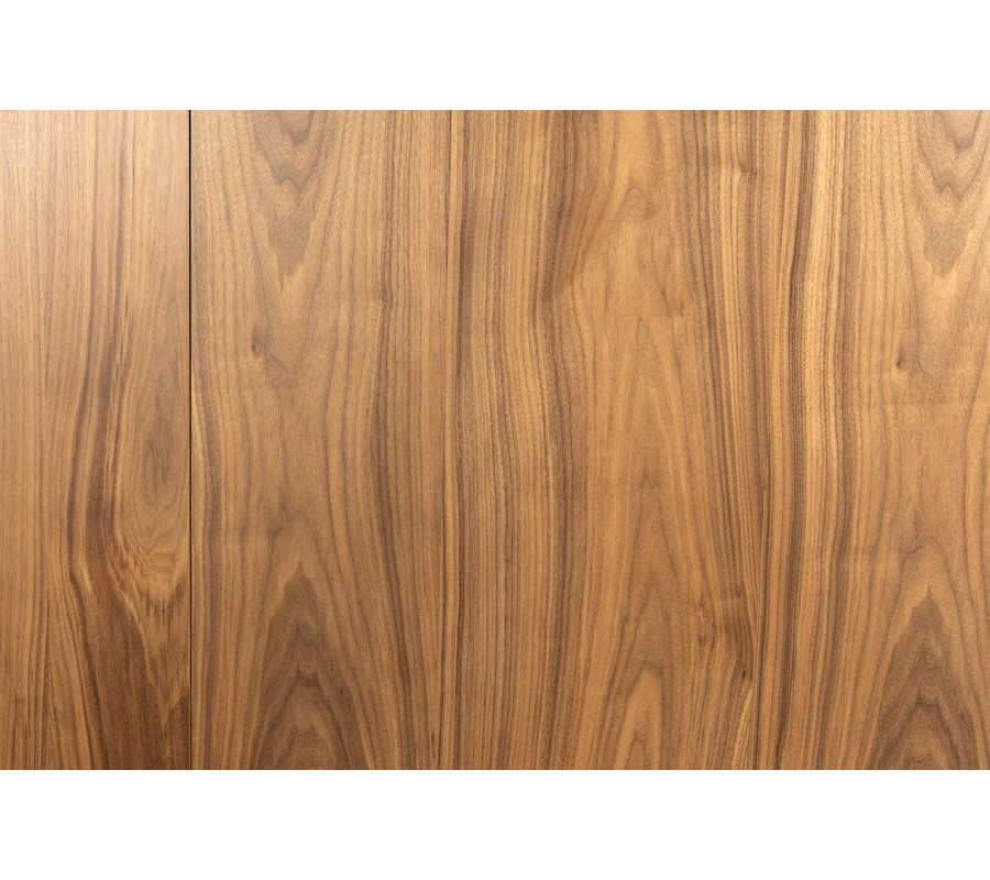Vrchní deska je vyrobena z kvalitní pravé ořechové dýhy v naturálním teplém hnědém odstínu s pravidelnou estetickou kresbou letokruhů v tmavších hnědých až šedých tónech. Boční hrany jsou zešikmené, což dodává stolu moderní dynamický vizuál, který vypadá dobře ve složeném i rozloženém stavu.
