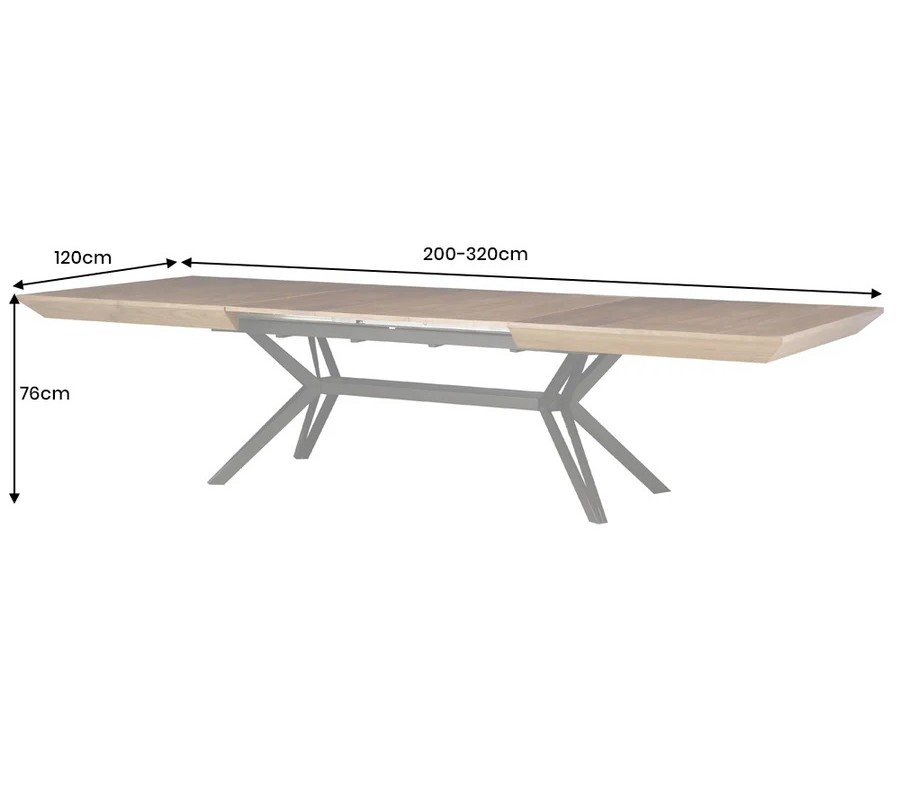 Obdélníková vrchní deska má ve složeném stavu délku 200 cm a poskytne sezení pro šest až osm osob. Její dvě poloviny lze od sebe odtáhnout, při čemž se ve středové části vysunou čtyři panely o délce 40 cm. Maximální délka stolu při rozložení je 320 cm, s maximální kapacitou 10 až 12 osob. Stůl lze používat i při částečném rozložení na rozměry 240 cm nebo 280 cm.