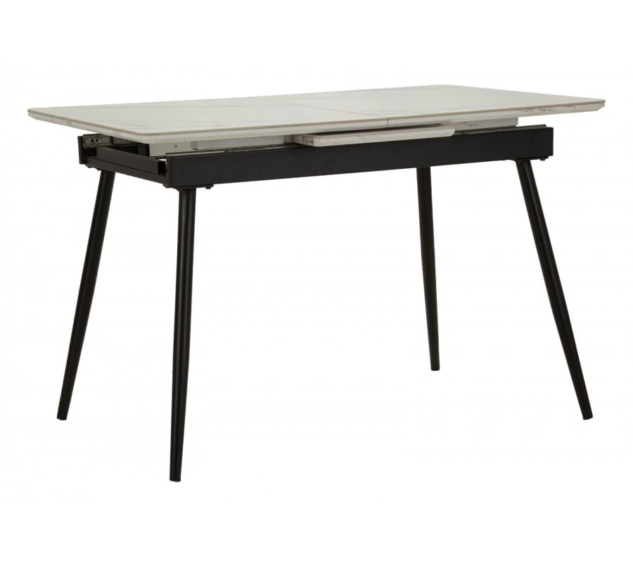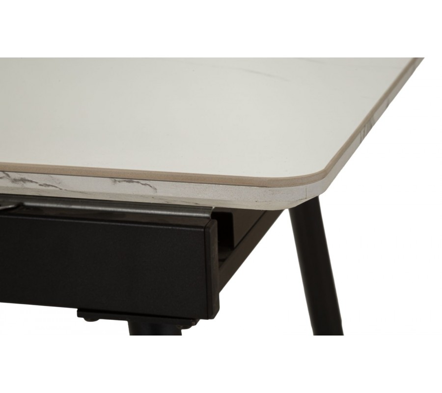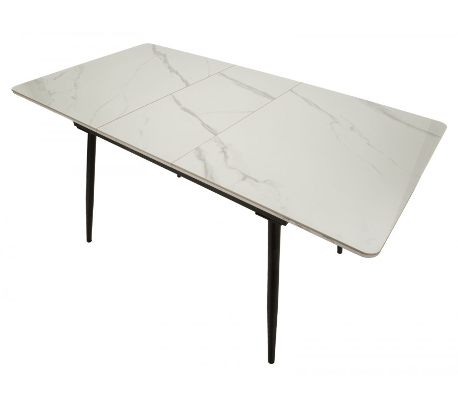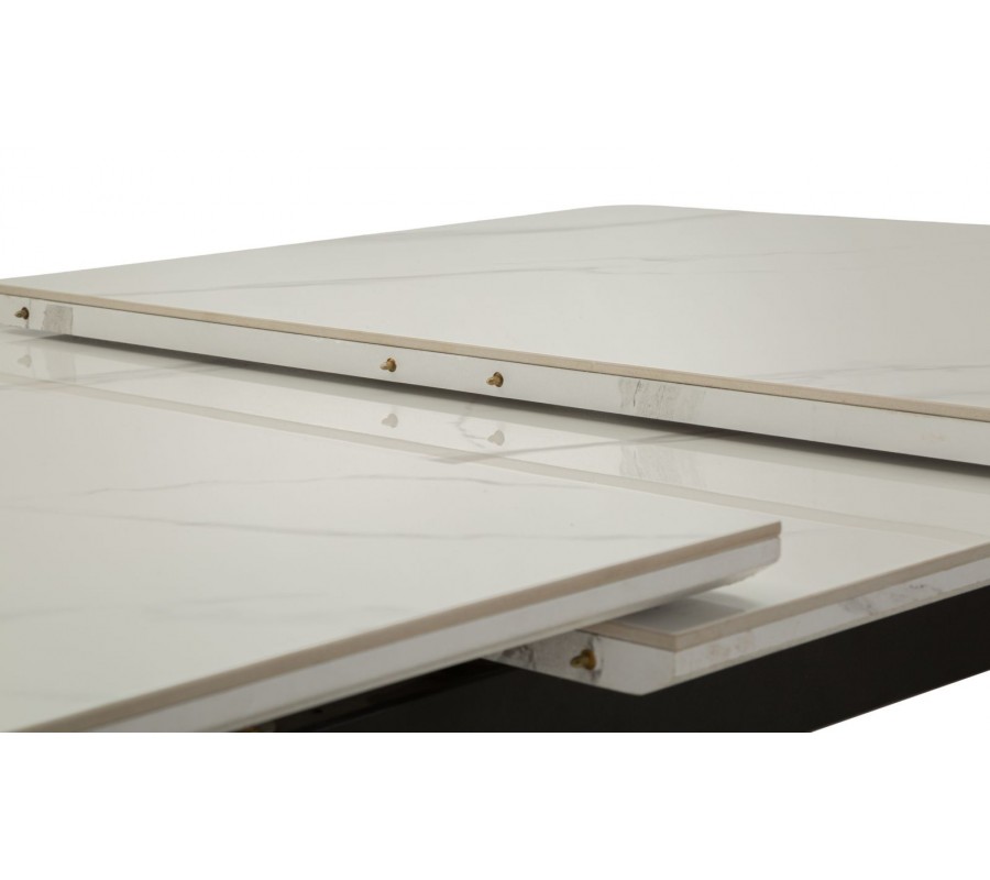 Stůl má obdélníkovou vrchní desku s elegantně zaoblenými rohy. Je vyrobena z keramiky s designem bílého mramoru s jemnými šedými žilkami. Povrch je pevný, odolný a nenáročný na údržbu. S délkou 120 cm poskytne stolovací místo pro čtyři osoby. Při rozložení se uprostřed vyklopí dva panely a stůl se prodlouží na 155 cm. V této konfiguraci usadíte čtyři hosty s nadstandardním komfortem nebo až šest hostů.