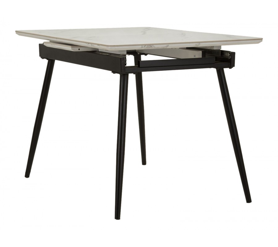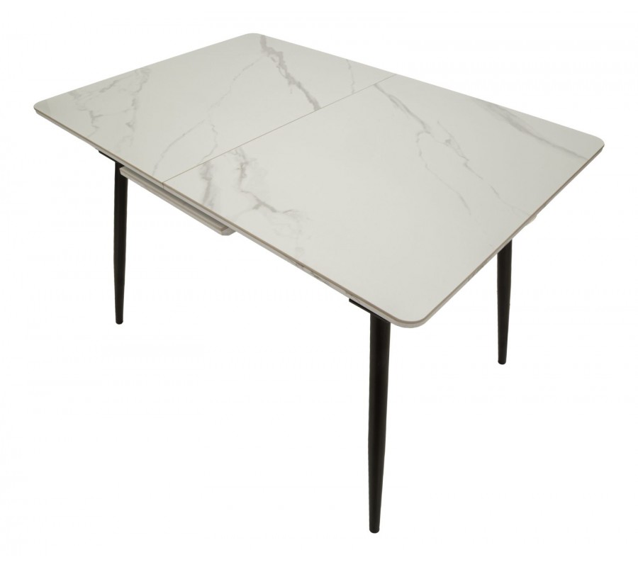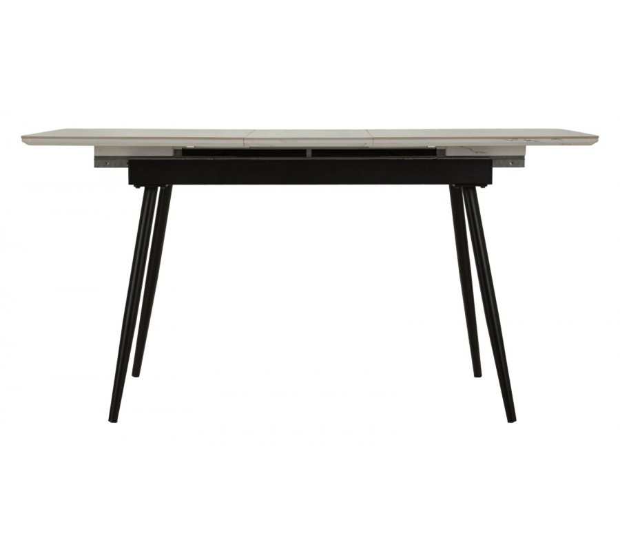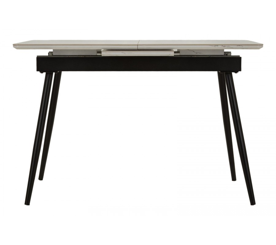 Moderní obdélníkový rozkládací jídelní stůl Tarro s bílou deskou s mramorovým designem a černýma nohama 120-155 cm