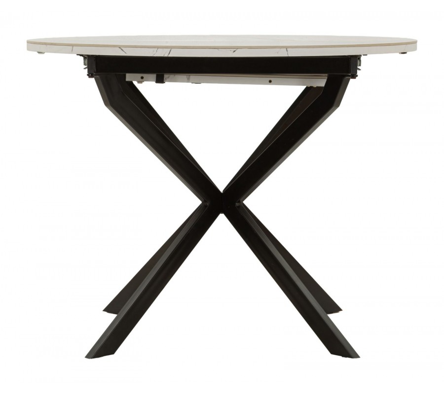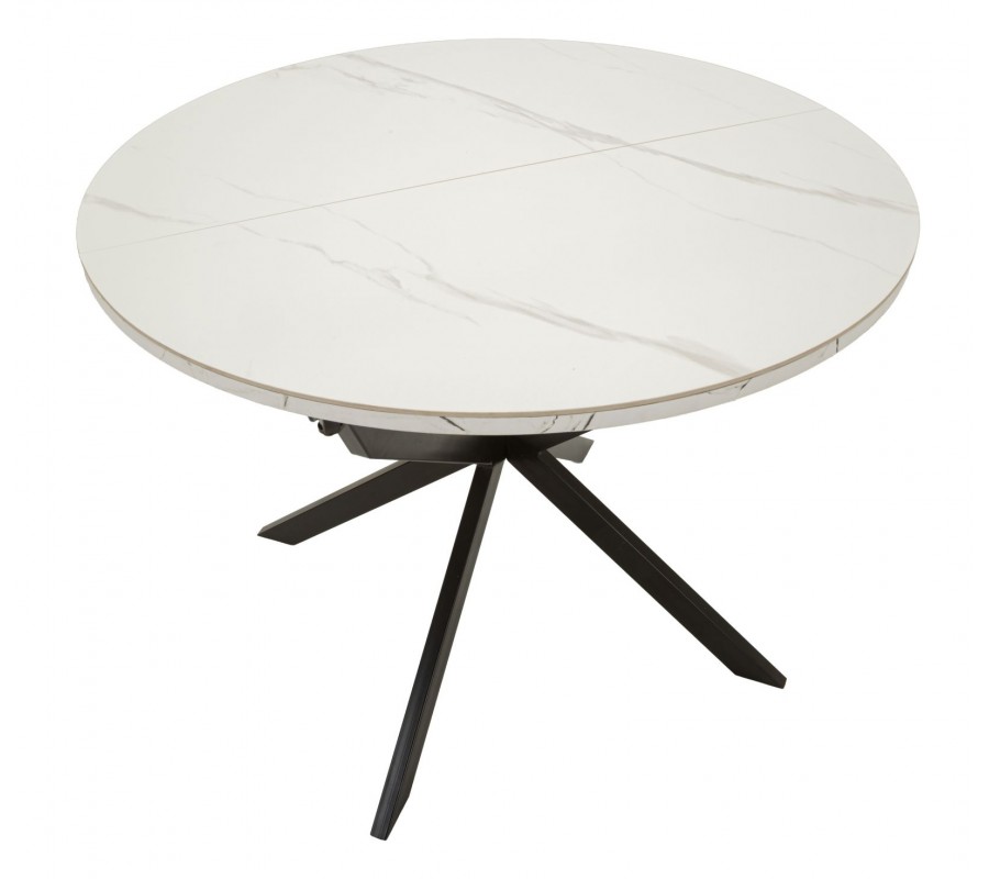 Moderní mramorový kulatý rozkládací jídelní stůl Tarro s bílou deskou s šedou kresbou a černou podstavou 100-140 cm