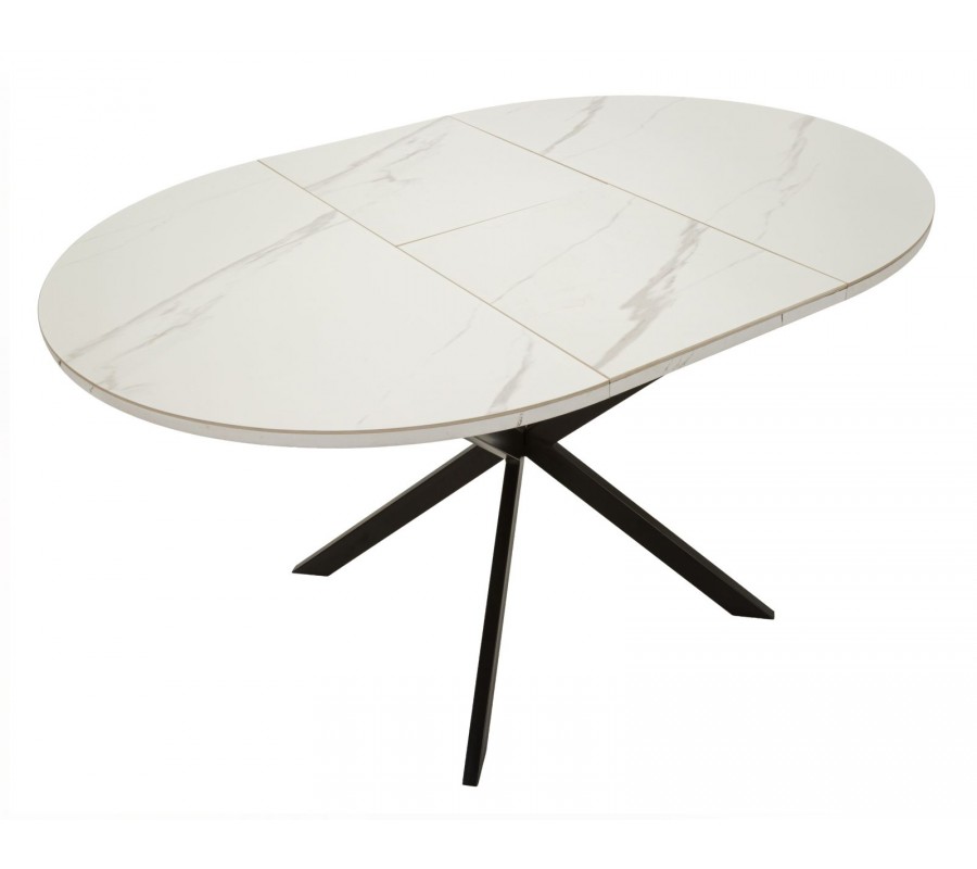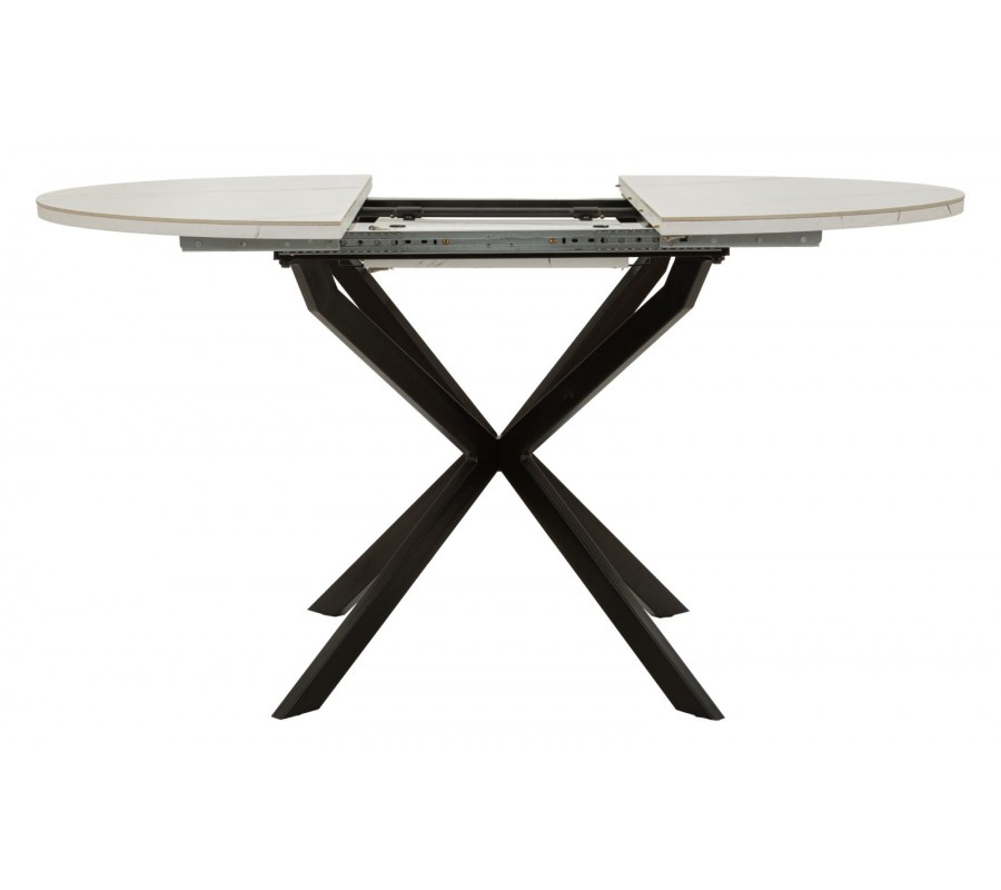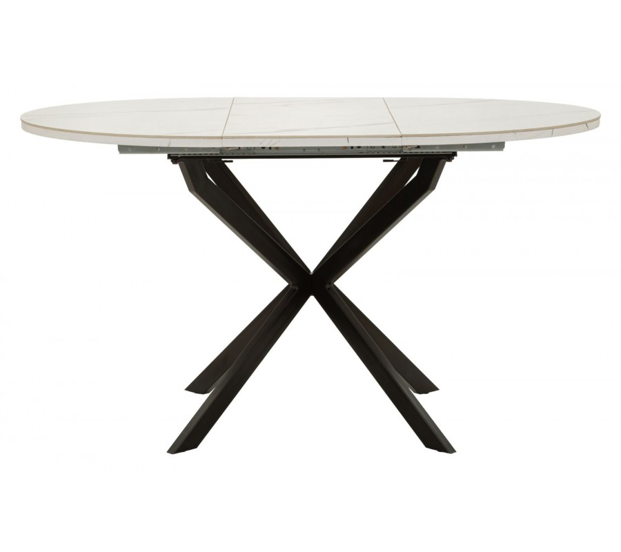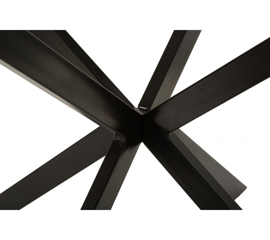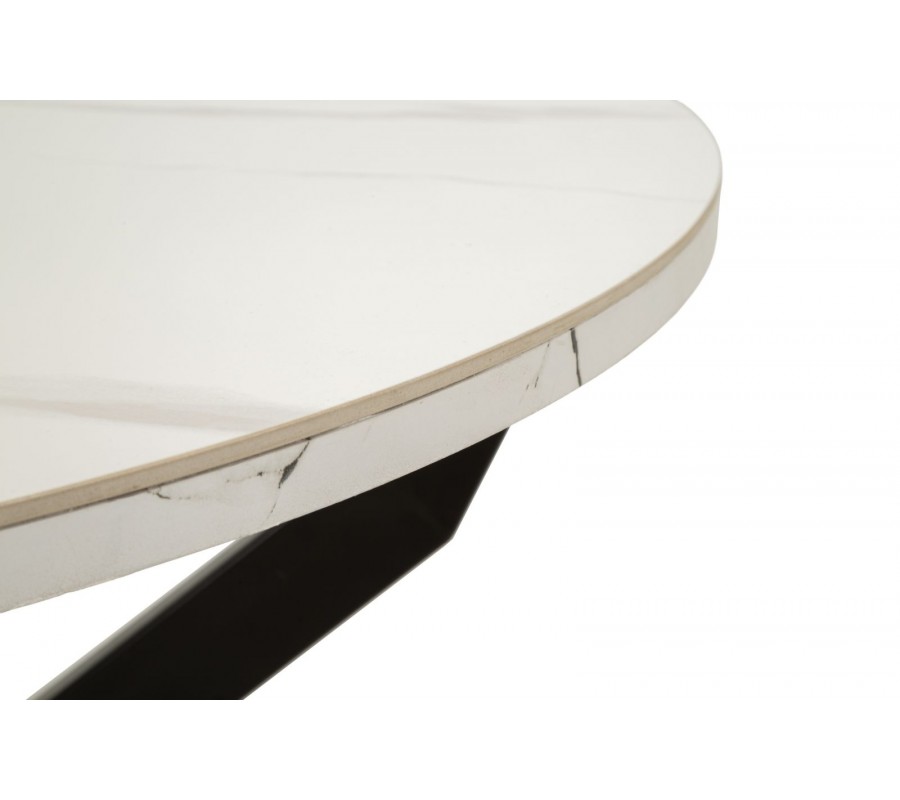 Vrchní deska je vyrobena z keramiky, která poskytuje odolný a na údržbu nenáročný povrch. Mléčnou bílou barvu doplňuje elegantní šedé mramorové žilkování. Podstava je vyrobena z kovu v černé barvě, který výborně ladí s mramorem a působí minimalisticky. Čtyři nožičky mají hranatý profil a jsou uprostřed zkřížené. Vytváří odlehčenou vzdušnou siluetu a zároveň poskytují dostatek místa při sezení.