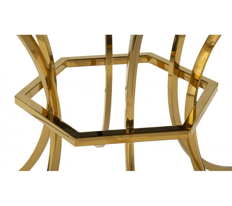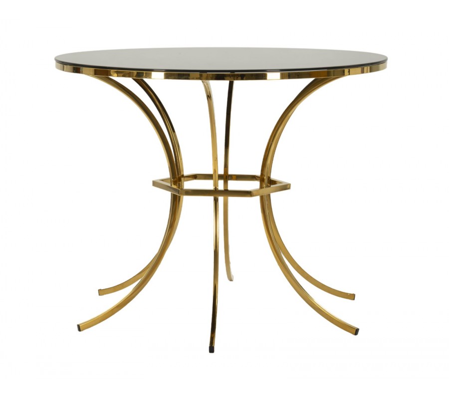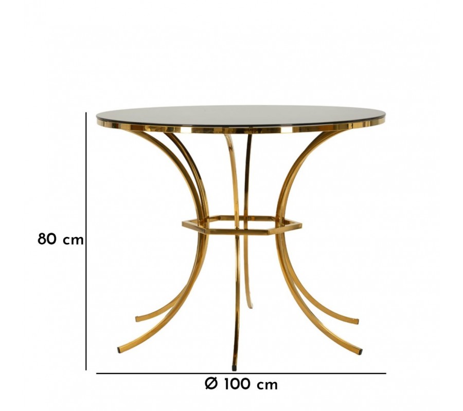 Stůl má kulatou vrchní desku vyrobenou ze skla v černé barvě. S průměrem 100 cm poskytne stolovací místo pro čtyři osoby. Je zasazena v zlatém kovovém rámu, který ji lemuje po obvodu. Podstava dodává nábytku výrazný designový charakter s dotekem estetiky art deco stylu. Dominuje jí pravidelnost a geometrické tvary. Šest nožiček má štíhlý čtyřhranný profil a jsouprohnuty do pravidelného půloblouku. Ve středu výšky se nachází šestiúhelníkový spojovací prvek ve stejném provedení a každá nožička je upevněna zevnitř ke středu jedné z jeho stran.