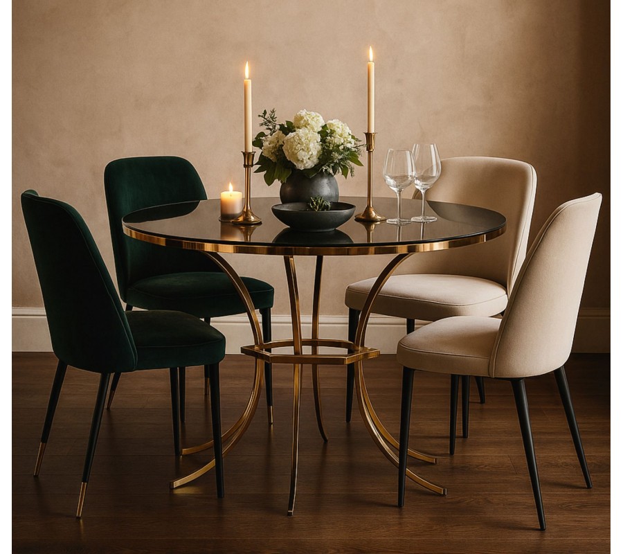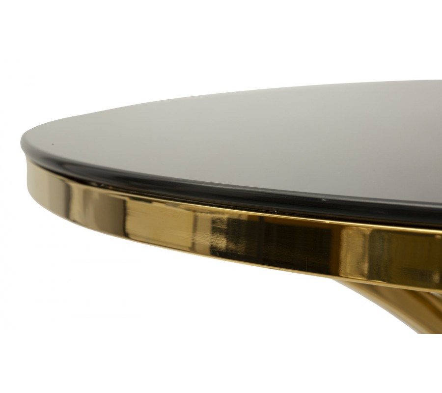 Zaoblené linie působí elegantním dojmem a štíhlá silueta je vzdušná a odlehčená. Vysoký lesk černého skla se výborně propojuje s metalickou zlatou kovovou konstrukcí v sofistikované kompozici. Díky odraženému světlu tak stůl pomůže i přes tmavší odstíny prostor prosvětlit a přinese do něj luxusní zářivý centrální prvek.