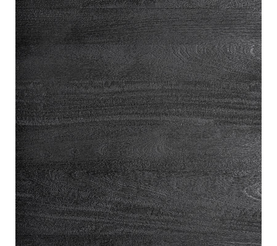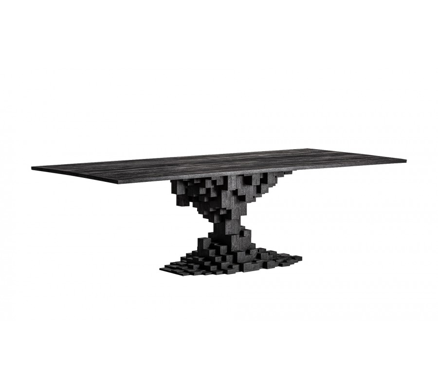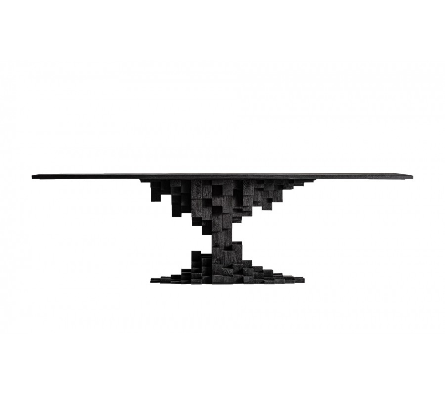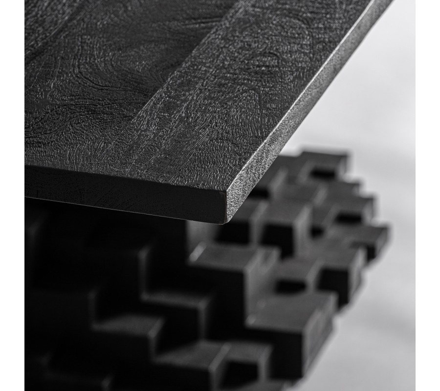Luxusní art deco geometrický masivní jídelní stůl Cubia Nera v obdélníkovém tvaru je vyroben z masivního mangového dřeva v hlubokém černém odstínu a představuje výjimečný solitér určený pro reprezentativní prostory. Jeho monumentální podnož z precizně vrstvených dřevěných kostek vytváří výrazný tvar přesýpacích hodin, který působí jako sochařský sloup – robustní, architektonický a slavnostní. Velkorysá deska je podepřena jediným centrálním pilířem, čímž stůl získává vizuální sílu a zároveň umožňuje maximální komfort při sezení bez omezení klasickými rohy či nohama.