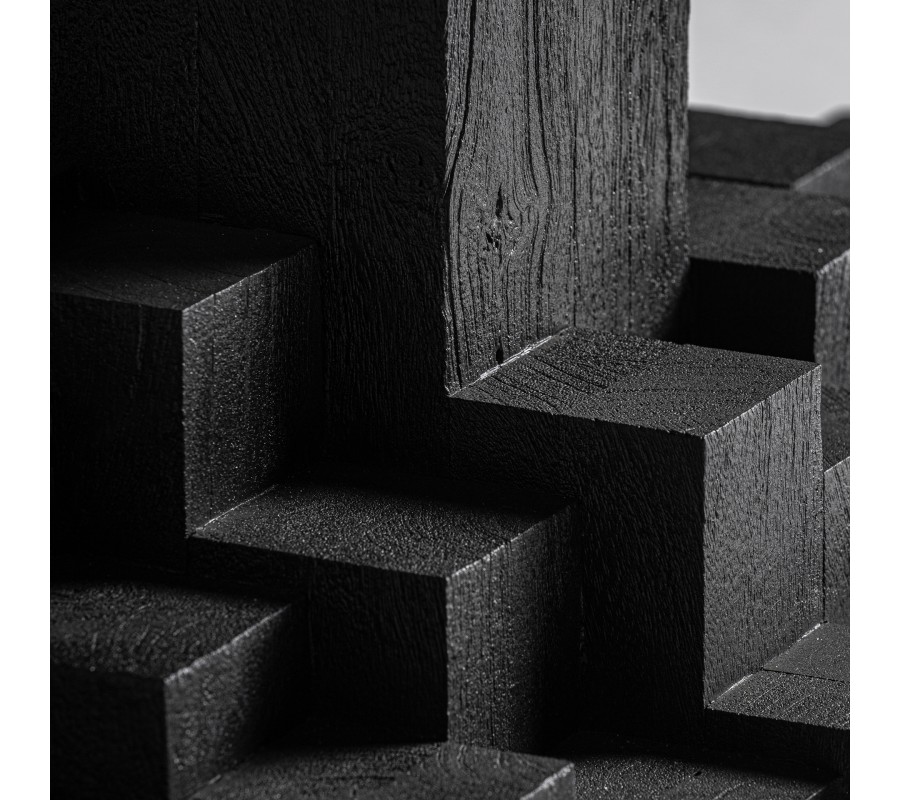 Charakter tohoto modelu stojí na čisté geometrii, výrazné hmotě a precizním řemeslném zpracování. Každý kus je ručně vyrobený, přičemž přirozené rozdíly v stínech, tónech a struktuře dřeva, jakož i drobné nedokonalosti – boule, jemné praskliny či kresba materiálu – jsou autentickým znakem masivu a důkazem jeho originality. Nejedná se o sériový nábytek, ale o investiční designový kus, který svojí váhou, proporcemi a výrazem definuje celý prostor.