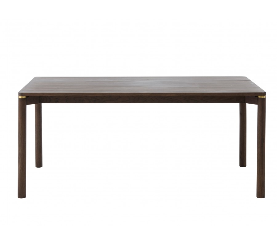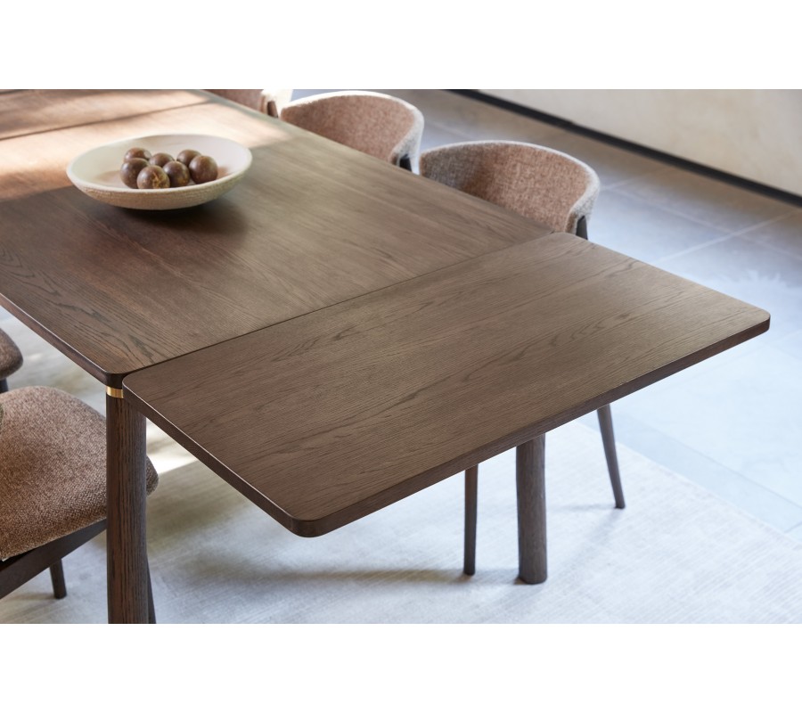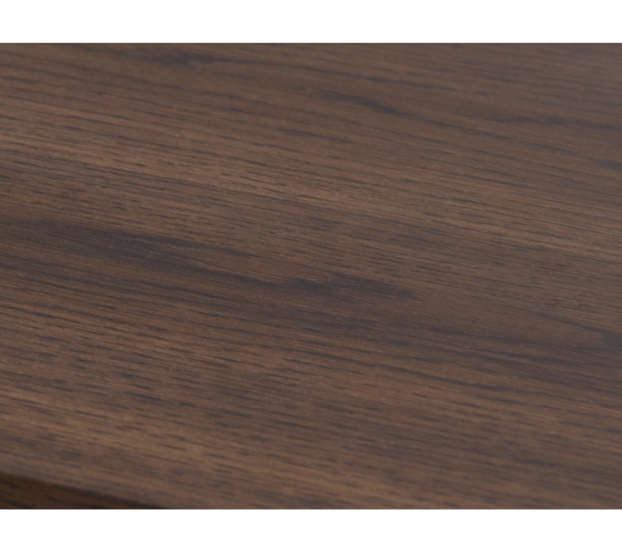 Moderní jídelní stůl Linia zaujme elegantním designem s jemným nádechem stylu art deco a povrchovým zpracováním s přirozeným dřevěným vizuálem. Má obdélníkový tvar a je vyhotoven z kombinacedubové dýhy, masivního dubového dřeva a MDF v tmavě hnědém odstínu, přičemž výrazná kresba letokruhů dodává povrchu hloubku a dost přirozený charakter. rohy, které zjemňují celkový vzhled a přispívají k elegantnímu působení stolu.