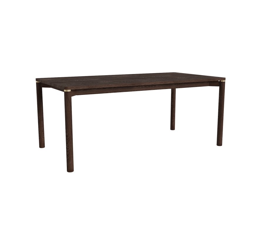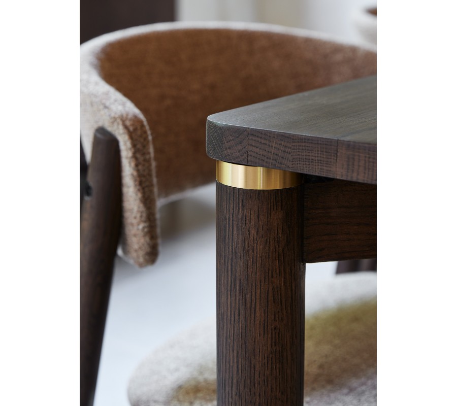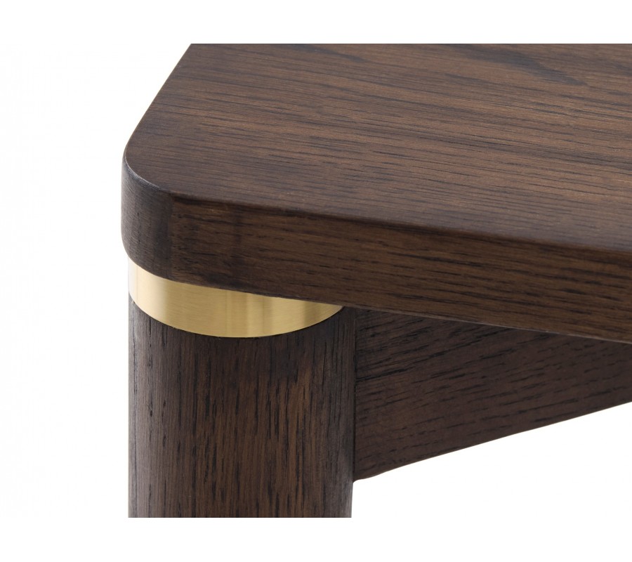 Stůl stojí na válcovitých dřevěných nožičkách, které mu dodávají stabilitu a vizuální lehkost. V místě napojení nohou na prkno se nacházejí jemné detaily ve zlatém kovovém vzhledu, které vytvářejí elegantní kontrast s tmavým dřevem a podtrhují jeho sofistikovaný charakter.