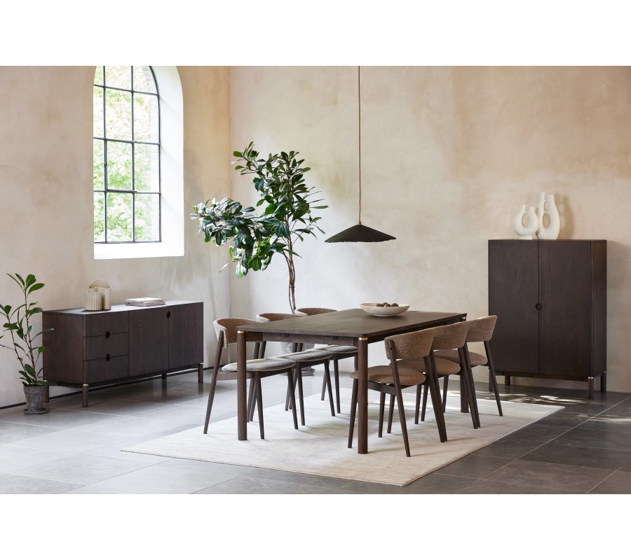 Jídelní stůl Linia se výborně hodí do moderních jídelen, elegantních obývacích prostor propojených s kuchyní nebo interiérů s jemným retro či art deco nádechem. Krásně se kombinuje se židlemi čalouněnými v béžových, krémových, karamelových nebo šedých odstínech, se sametovými nebo koženými potahy. Harmonicky doplňuje materiály jako mramor, travertin, keramika či sklo a velmi dobře ladí také s doplňky ve zlatém, bronzovém nebo černém kovovém vzhledu. V interiéru vytváří výrazný, ale zároveň nadčasový prvek, který spojuje praktičnost s elegantním designem.