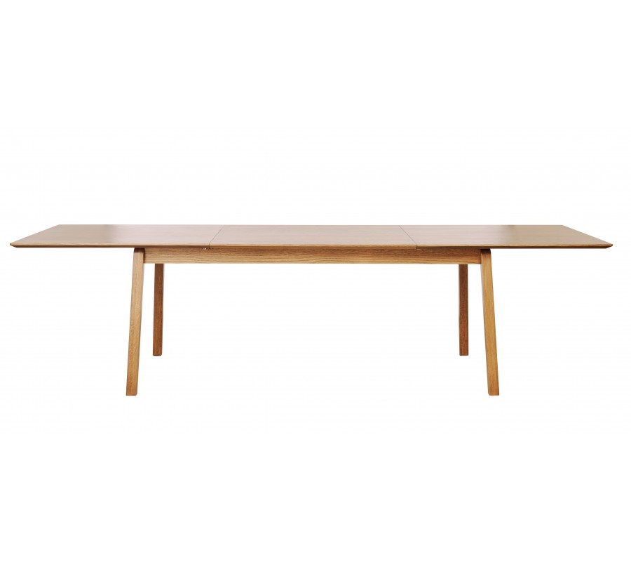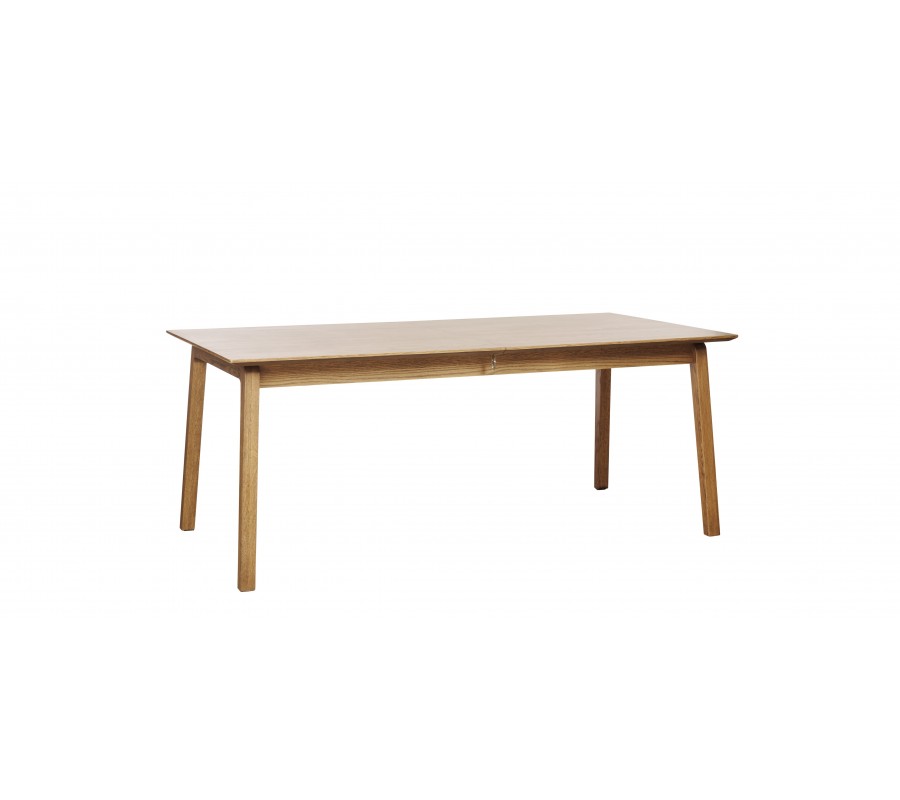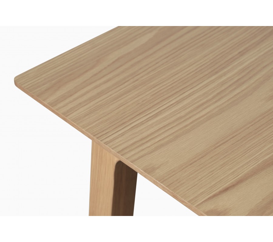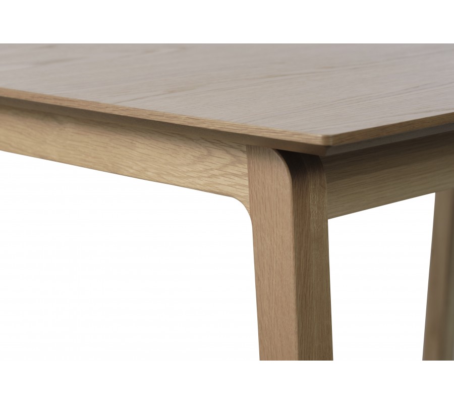Stůl má minimalistický design s promyšlenými detaily. Vrchní deska má obdélníkový tvar s elegantními zaoblenými rohy. Ze spodní strany je zpevněna obdélníkovým rámem, ke kterému se na rozích napojují čtyři hranaté nohy s jemně zešikmenou linií. Zajistí výbornou stabilitu a zároveň dodávají stolu tradiční výraz. Dubová dýha přináší do designu přírodní vizuál s pravidelnou kresbou letokruhů. Její světlá hnědá barva, typická pro skandinávský styl, působí útulně a teplo.
