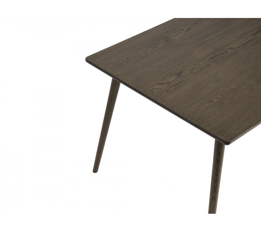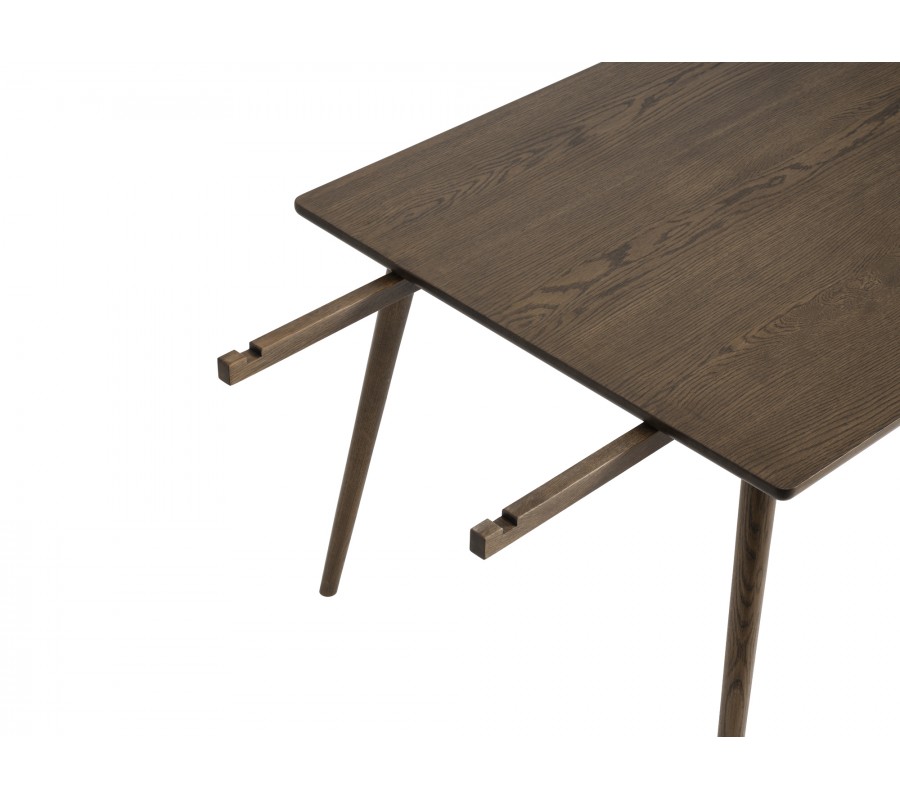 Stůl je vyroben z kombinace masivního a dýhovaného dubového dřeva. Povrch je upraven tmavě hnědým lakováním, které působí sofistikovaně a zároveň zvýrazňuje přirozenou kresbu letokruhů. Ta dodává nábytku autentický přírodní vzhled, typický pro severský design.