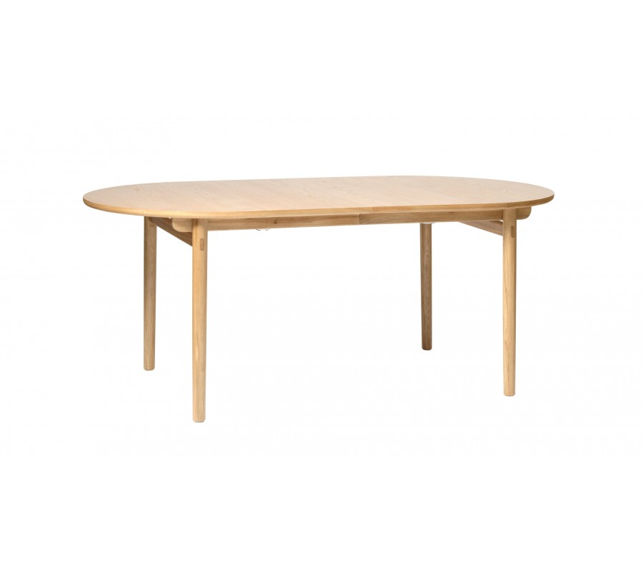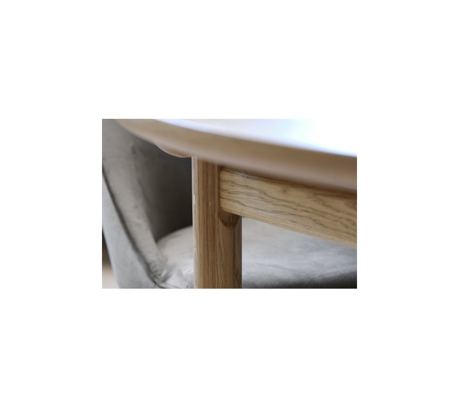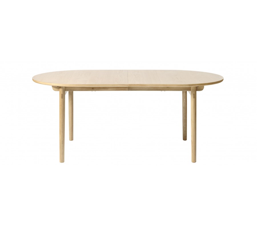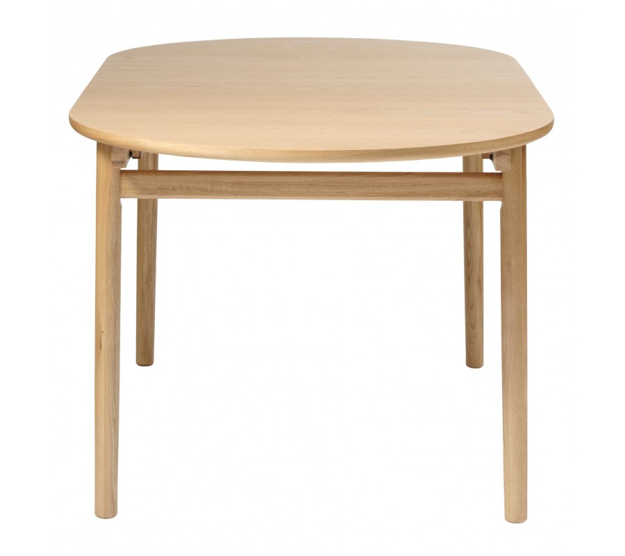 Jídelní stůl má minimalistickou siluetu s čistými tvary a hladkými povrchy, zatímco elegantní zaoblení mu dodávají jemný retro nádech, inspirován skandinávským designem z poloviny minulého století. Je vyroben z kombinace masivního a dýhovaného dubového dřeva. Přírodní světlá hnědá barva a pravidelná kresba letokruhů mu dodávají teplý a útulný výraz.