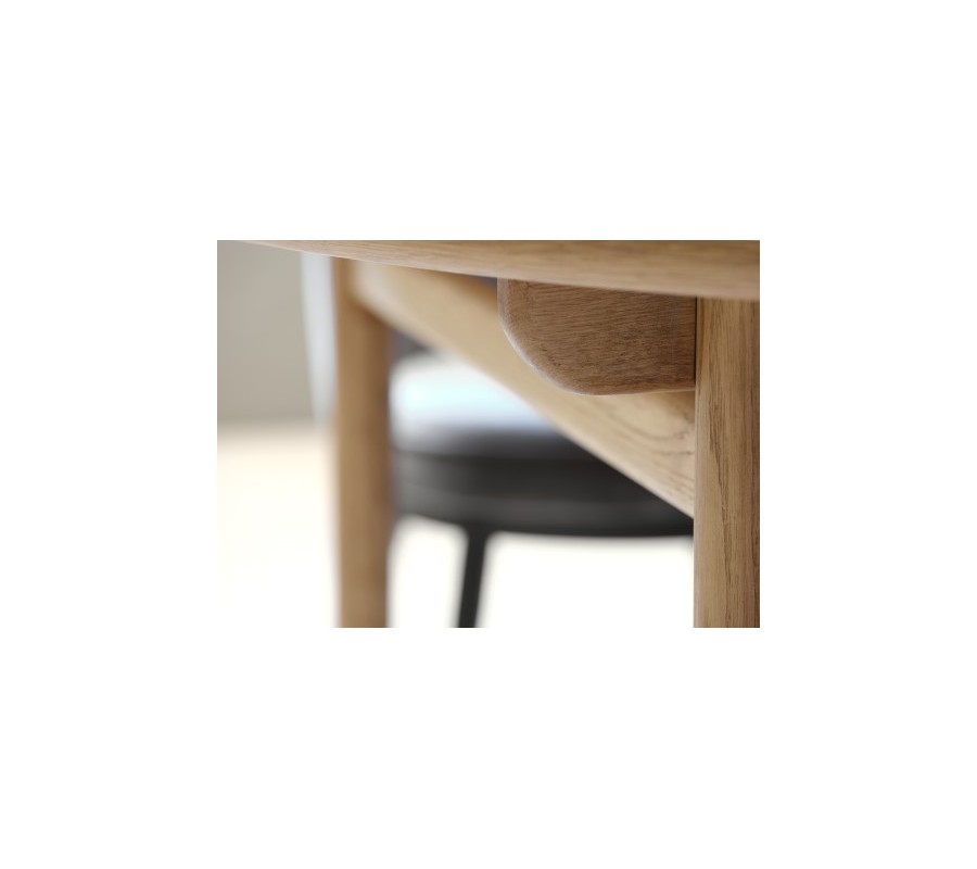 Jídelní stůl má minimalistickou siluetu s čistými tvary a hladkými povrchy, zatímco elegantní zaoblení mu dodávají jemný retro nádech, inspirován skandinávským designem z poloviny minulého století. Je vyroben z kombinace masivního a dýhovaného dubového dřeva. Přírodní světlá hnědá barva a pravidelná kresba letokruhů mu dodávají teplý a útulný výraz.