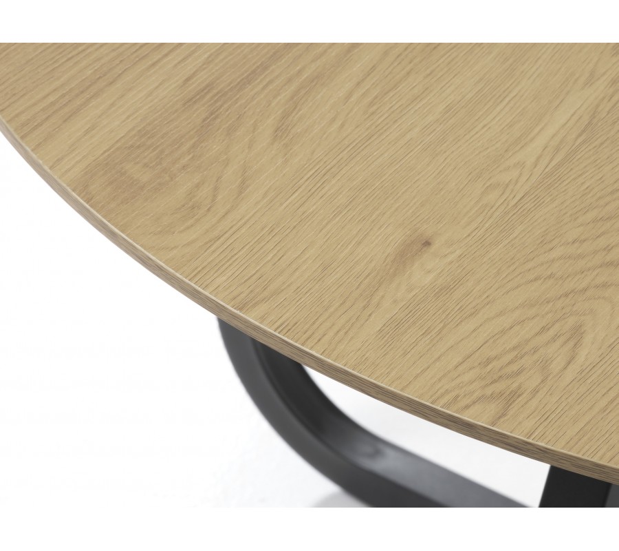 Stůl má kulatou vrchní desku ve světlém hnědém dubovém provedení s pravidelnou kresbou letokruhů. Je vyrobena z kvalitní dýhy s melaminovým povrchem. Ten jí zaručí vysokou pevnost a odolnost vůči teplu i vlhkosti. Stůl je tak ideální i pro každodenní používání.