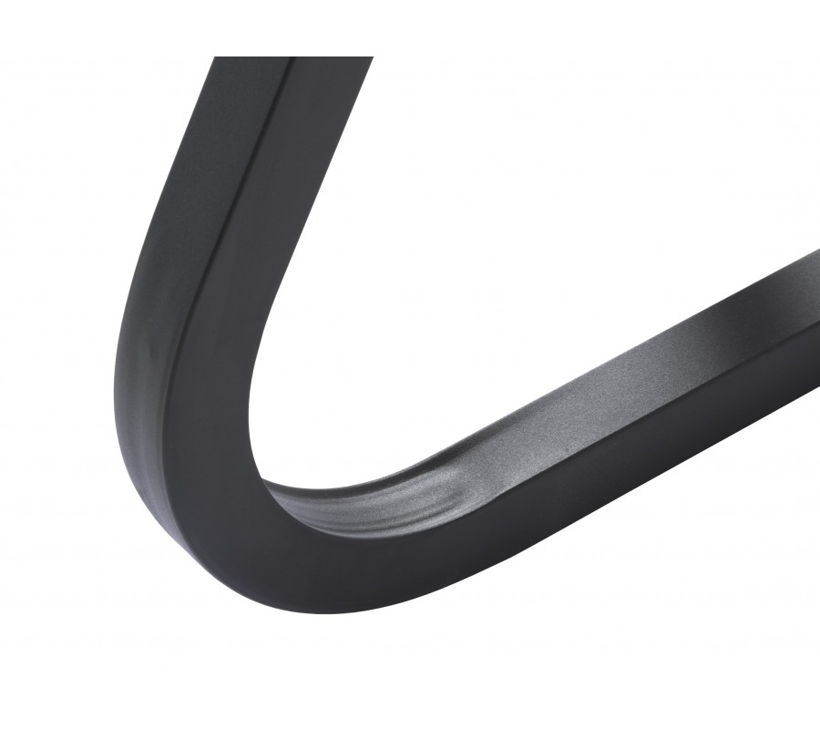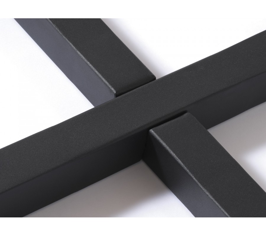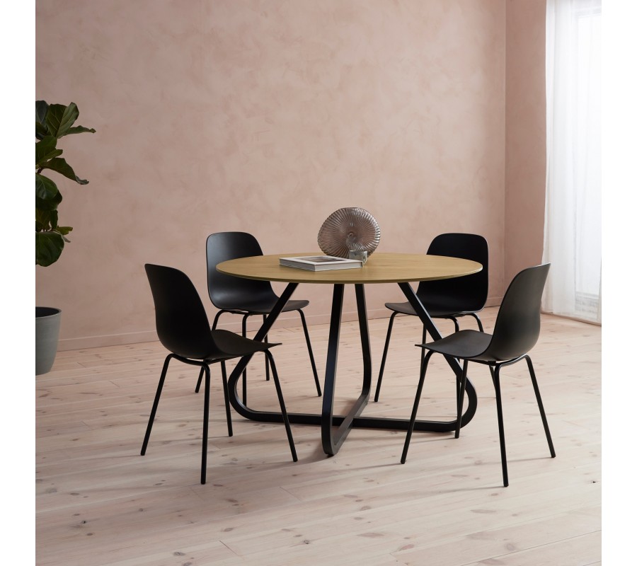 S teplým vizuálem dřeva kontrastuje podstava z kovu v matném černém provedení. Tvoří ji čtyři nohy s hranatým profilem. Ve vrchní části je jejich linie sešikmená a dole přechází ve výrazné křivce do výztuhy ve tvaru X, zajišťující výbornou stabilitu.