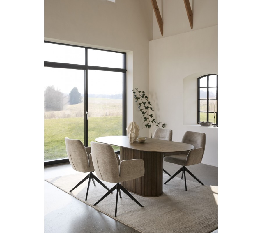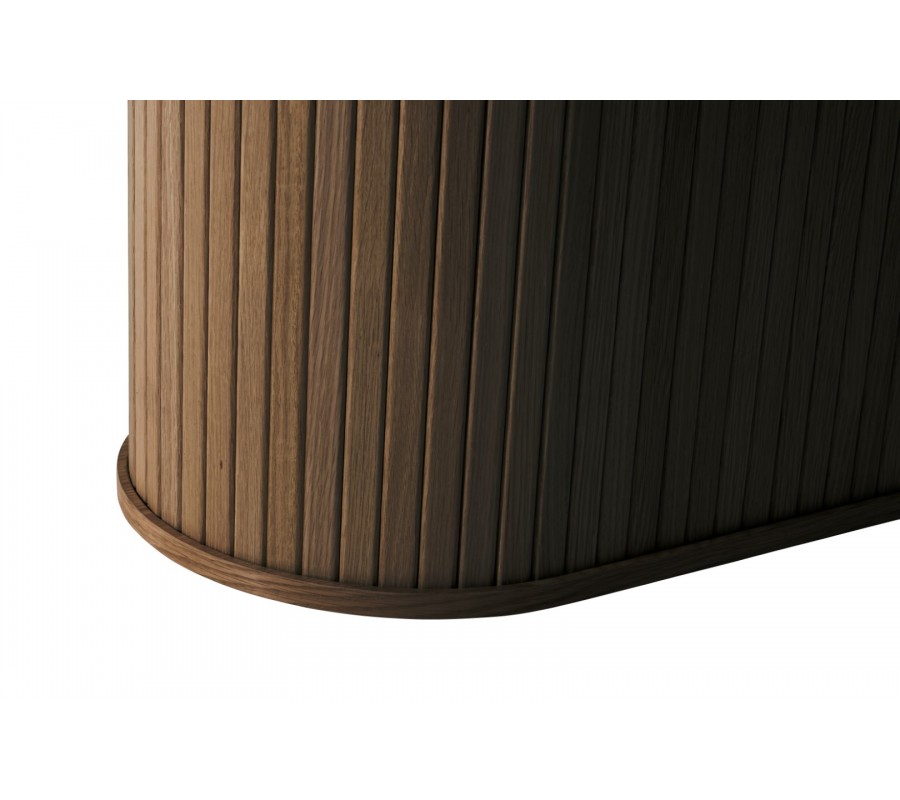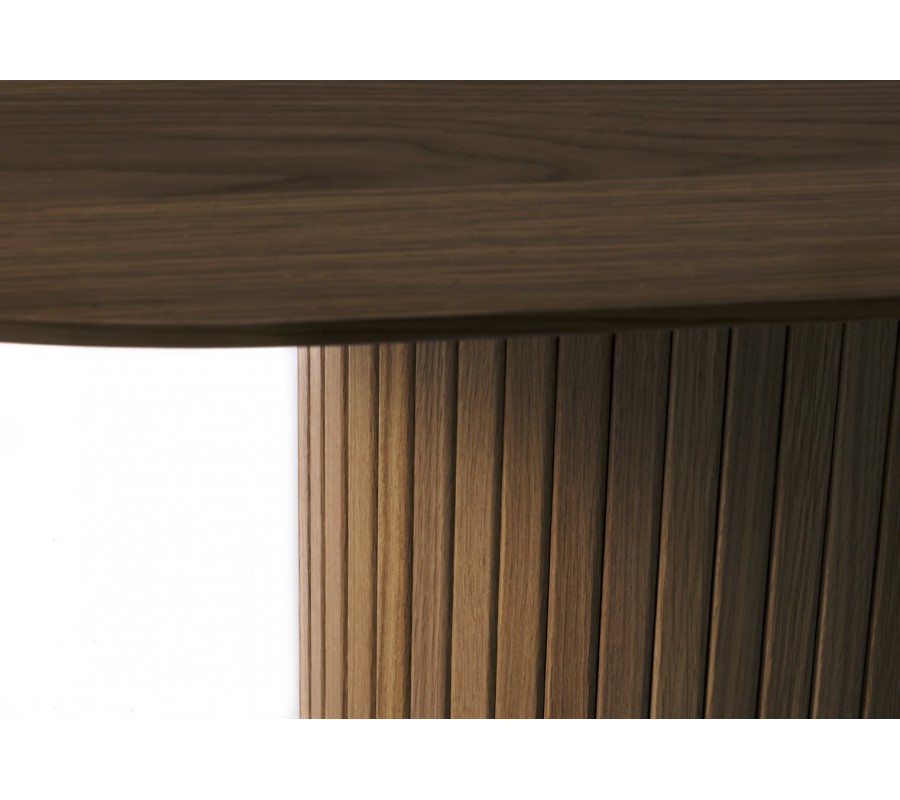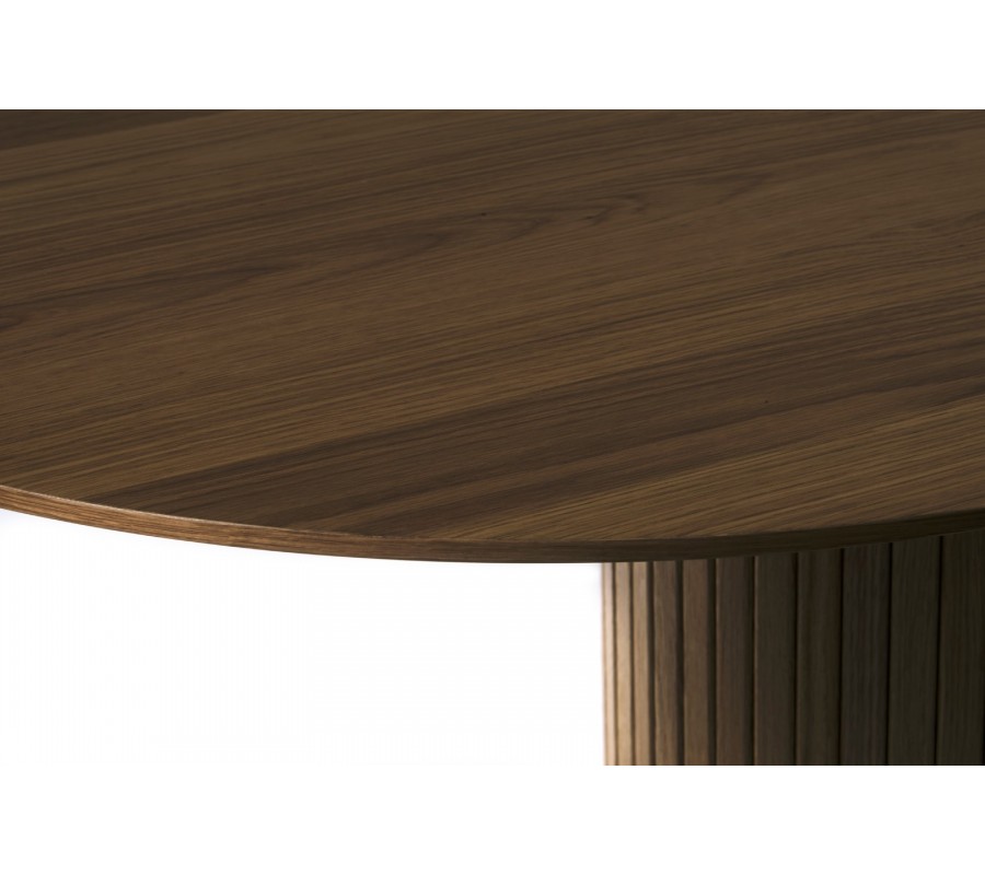 Stůl má elegantní siluetu, ve které dominují půvabné zaoblené linie. Designu dominuje mohutná oválná noha. Po obvodu ji zdobí vertikálně vykládaný lamelový reliéf, dodávající nábytku stylový retro charakter. Ve spodní části je doplněna o rozšířený rám pro lepší stabilitu. Ve vrchní části je na ní položena hladká oválná deska se štíhlým profilem, která působí odlehčeně.