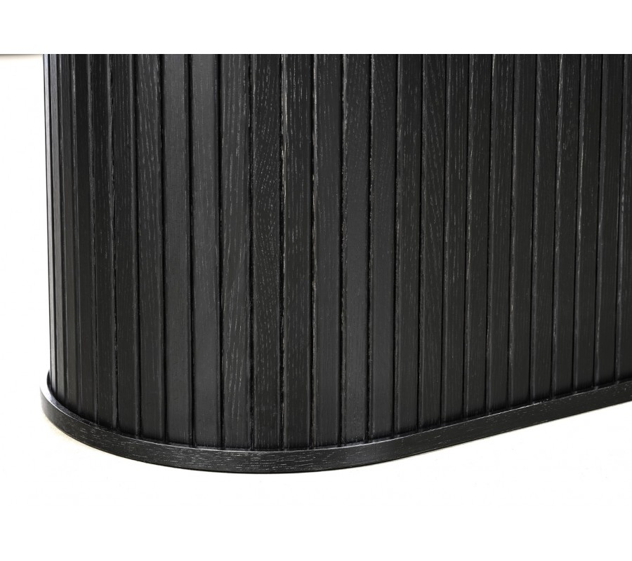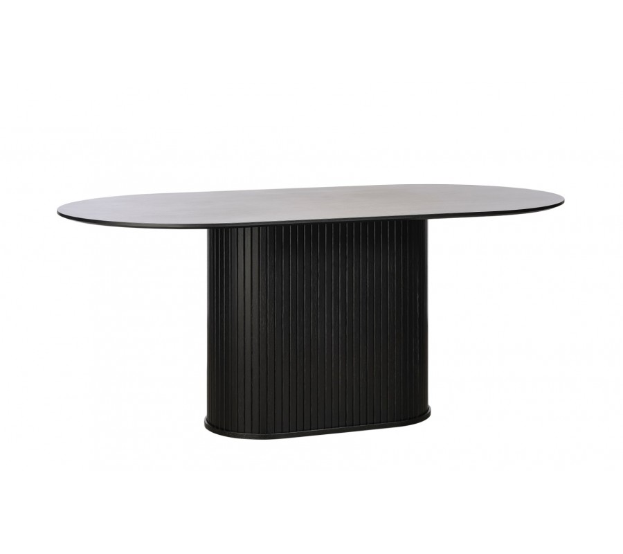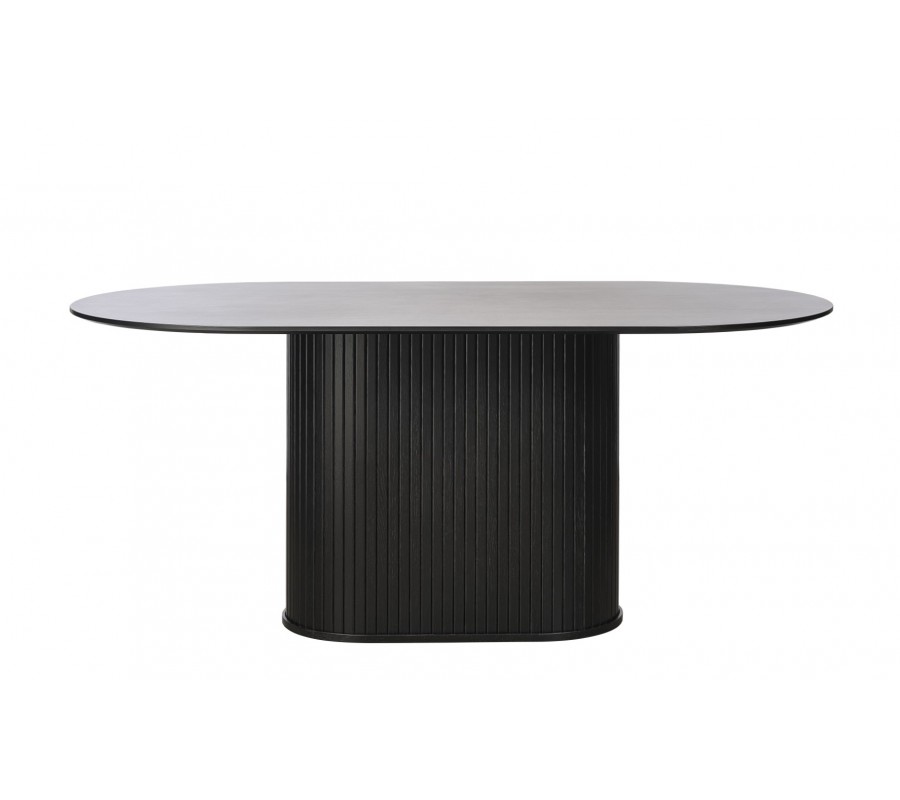Moderní černý jídelní stůl Bornholm s hladkou oválnou deskou a mohutnou nohou s lamelovým designem 180 cm