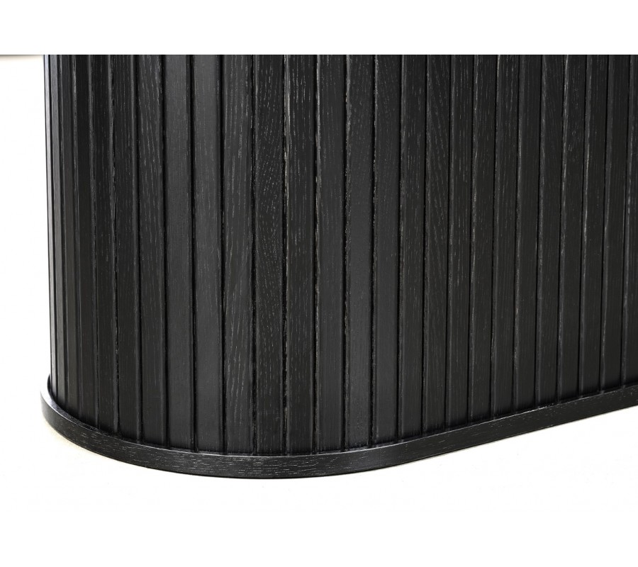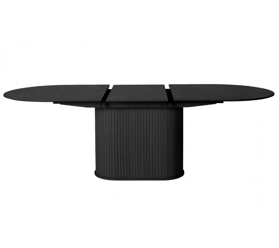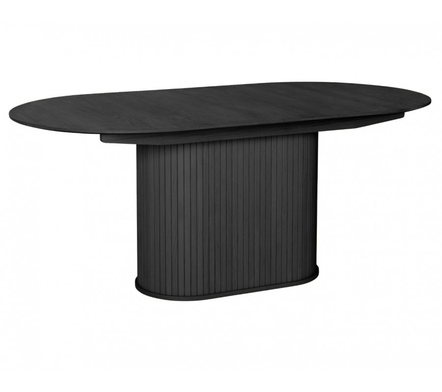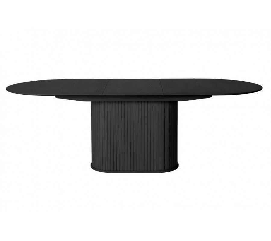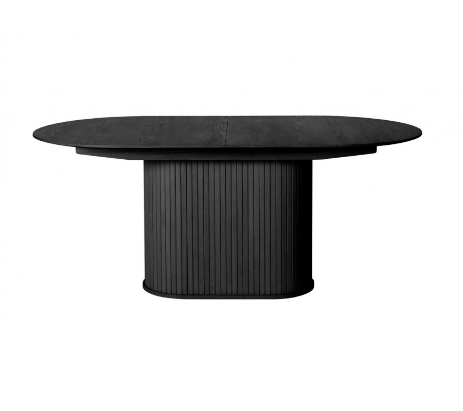 Moderní černý dubový jídelní stůl Bornholm s oválnou rozkládací deskou a mohutnou nohou s lamelovým dekorem 180-230 cm