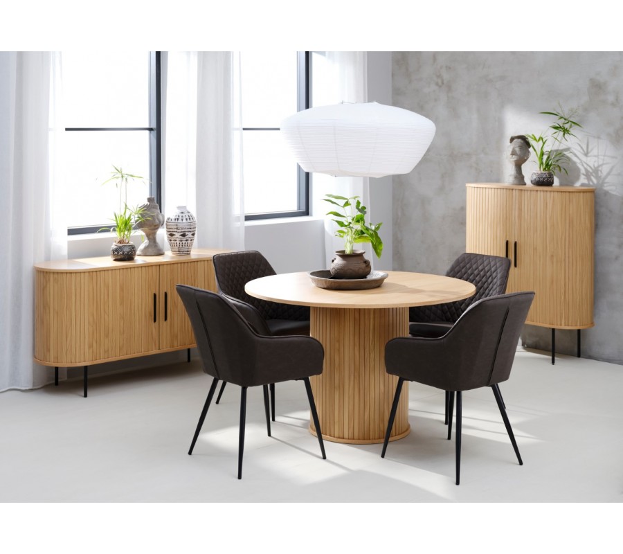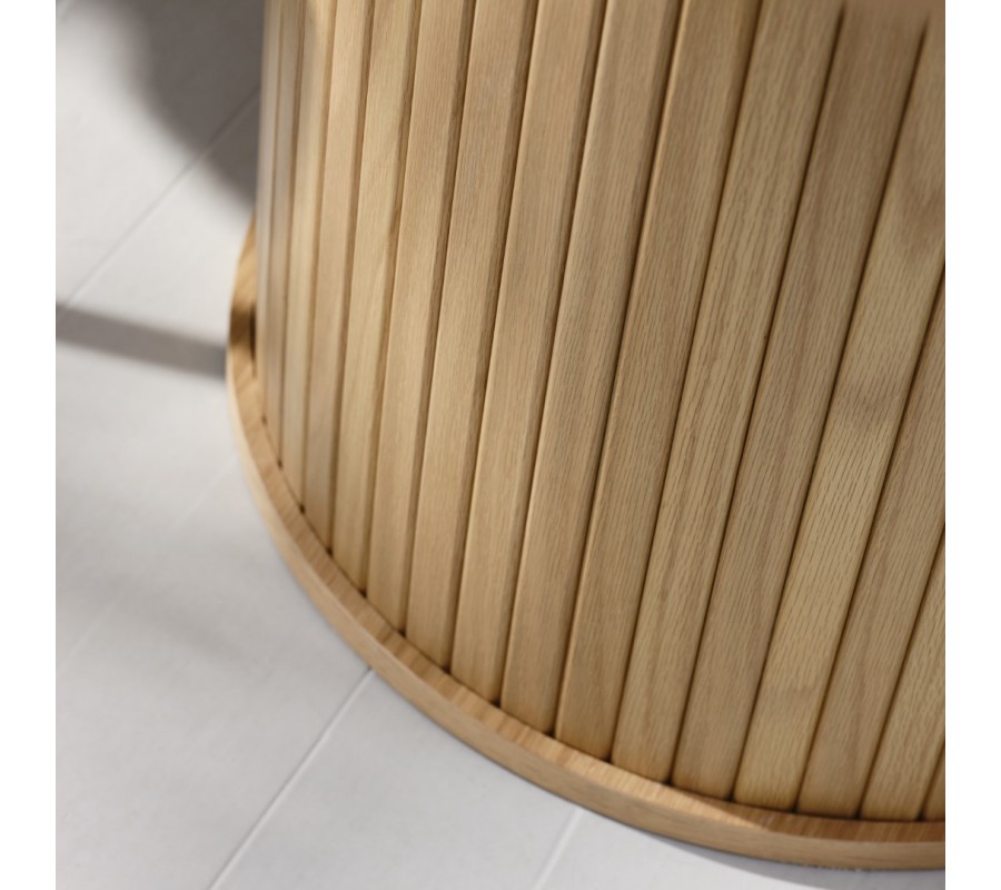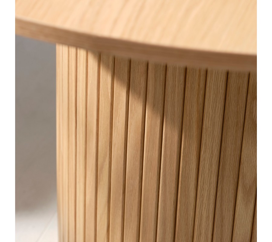 V designu dominují elegantní zaoblení a geometrické tvary, vytvářející minimalistickou siluetu. Na první pohled upoutá mohutná válcovitá noha, ve spodní části doplněná o nižší základnový rám pro ještě lepší stabilitu. Její obvod je vykládaný pravidelnými vertikálními lamelami, které dodávají stolu retro nádech. Kulatá vrchní deska je hladká a její štíhlý profil harmonicky vyvažuje robustní podstavu.