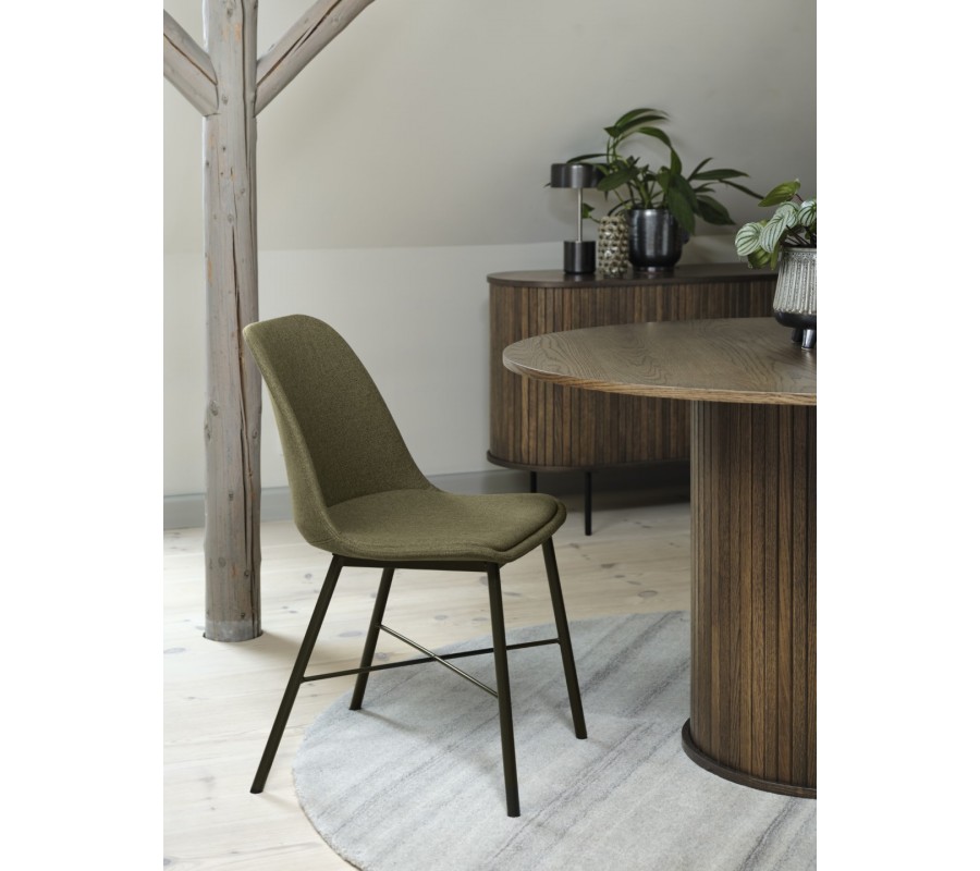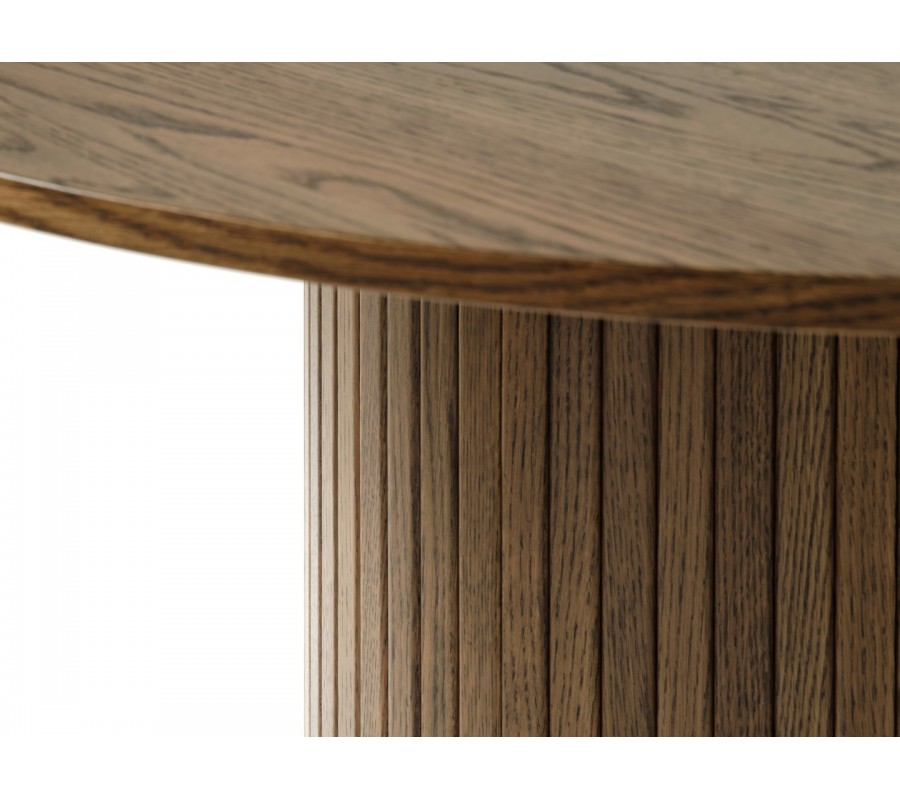 Stůl je vyroben z pravé dubové dýhy v kombinaci s MDF. Tmavě hnědý odstín zvýrazňuje přirozenou kresbu dřeva a podtrhuje jeho autentický přírodní vzhled, přičemž dodává nábytku typický severský vizuál.