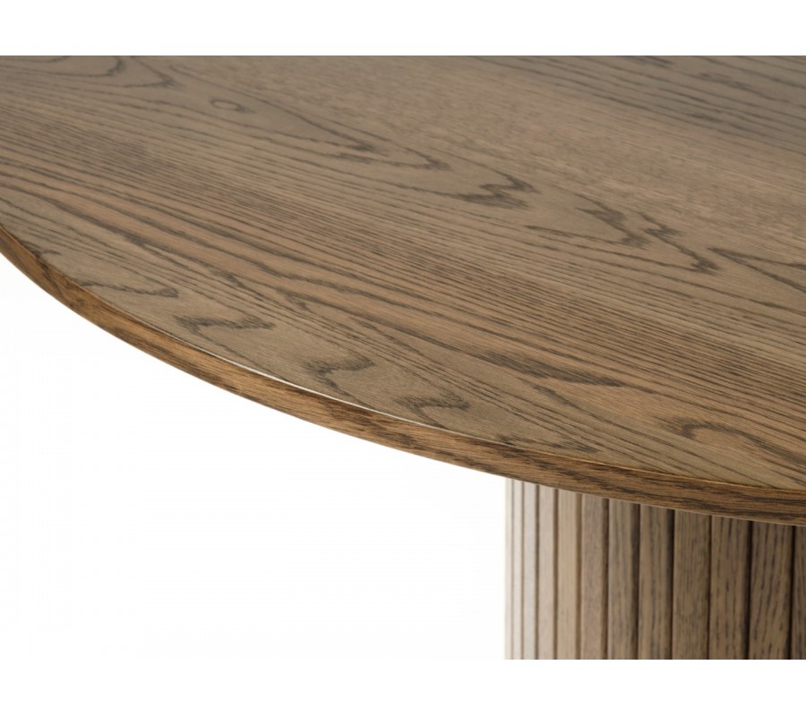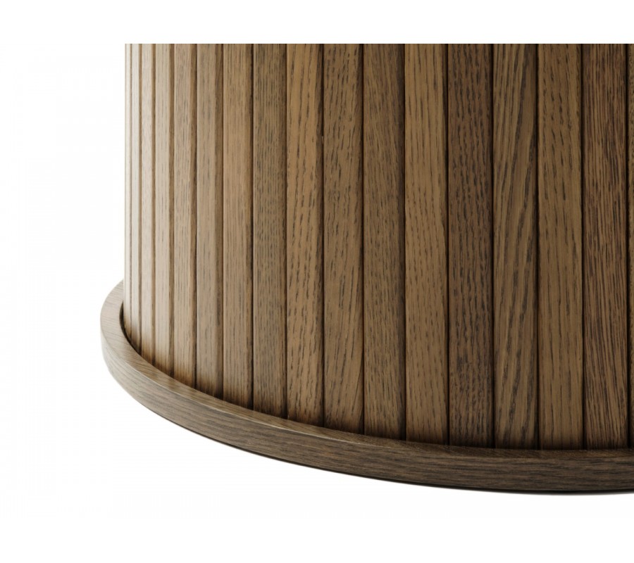 Design stolu se nese v duchu plynulých zaoblení a vyvážených tvarů, které vytvářejí minimalistickou nadčasovou siluetu. Dominantním prvkem je robustní válcovitá noha, doplněná ve spodní části o pevný kulatý základový rám pro vyšší stabilitu. Její povrch zdobí vertikální lamelování, které dodává celku jemný retro akcent. Hladká kulatá deska s tenkým profilem vytváří kontrast k mohutné podstavě a působí vizuálně snadno.