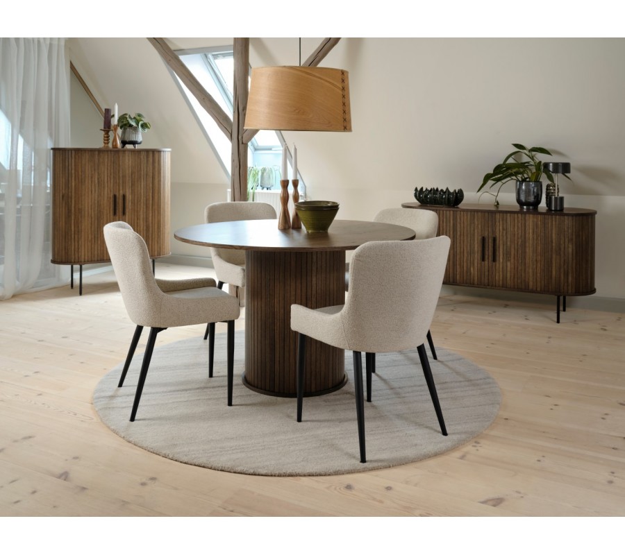 Jídelní stůl Bornholm představuje vkusné propojení čistého skandinávského designu a elegantních retro detailů. Provedení v tmavě hnědé barvě působí sofistikovaně a závěň dodá prostoru typický severský charakter. Kulatá deska o průměru 120 cm nabízí pohodlné stolování pro čtyři až pět osob.