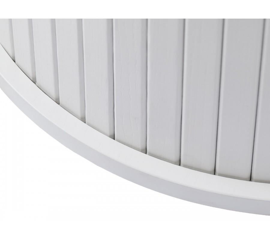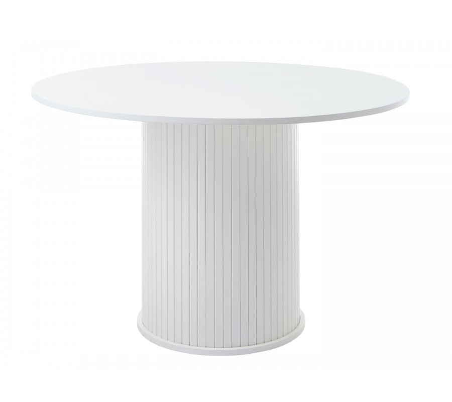 Moderní kulatý jídelní stůl Bornholm s válcovitou nohou s lamelovým dekorem a hladkou deskou v bílé barvě 120 cm
