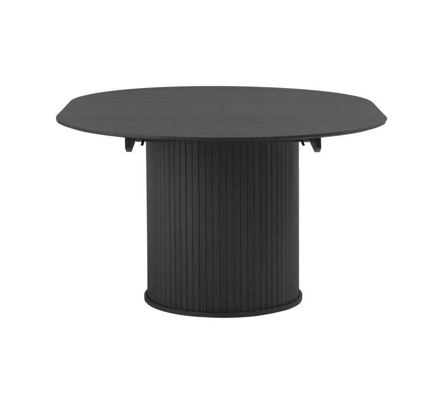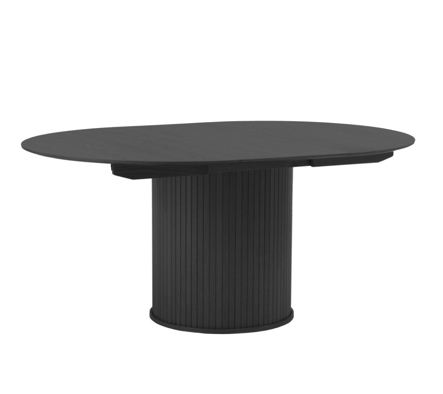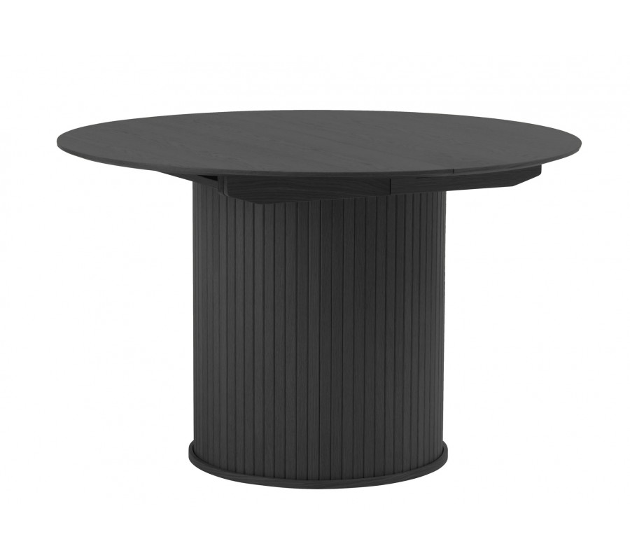 Moderní černý jídelní stůl Bornholm s kulatou deskou s rozkládáním na oválnou s lamelovou nohou v černé barvě 120-167 cm