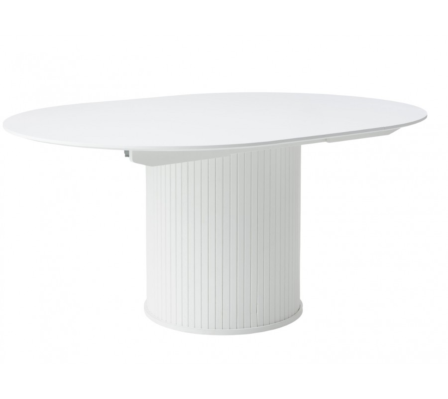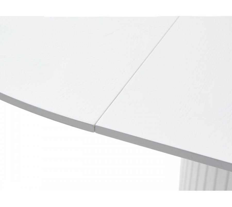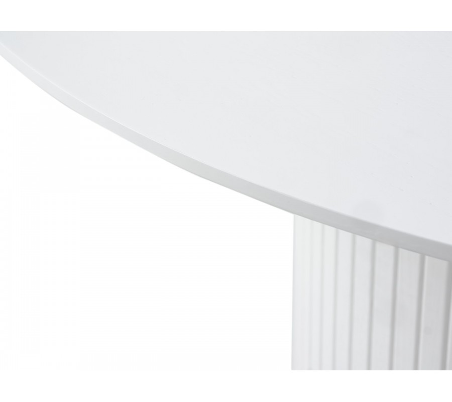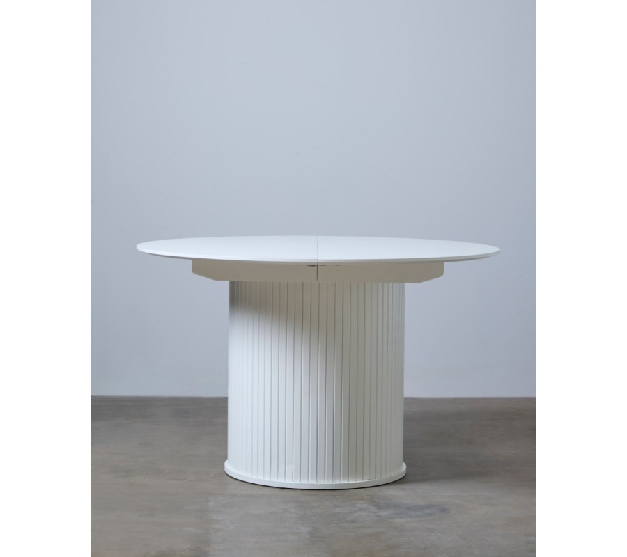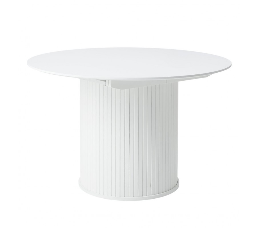 Moderní kulatý rozkládací jídelní stůl Bornholm v bílé barvě s hladkou deskou a nohou s lamelovým obkladem 120-167 cm