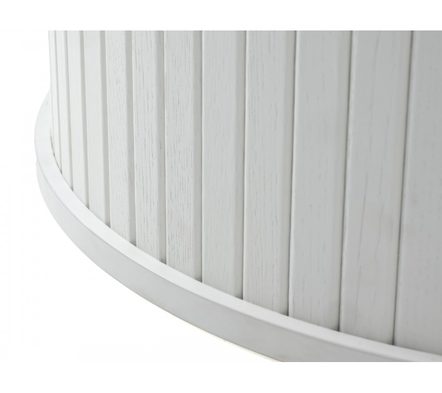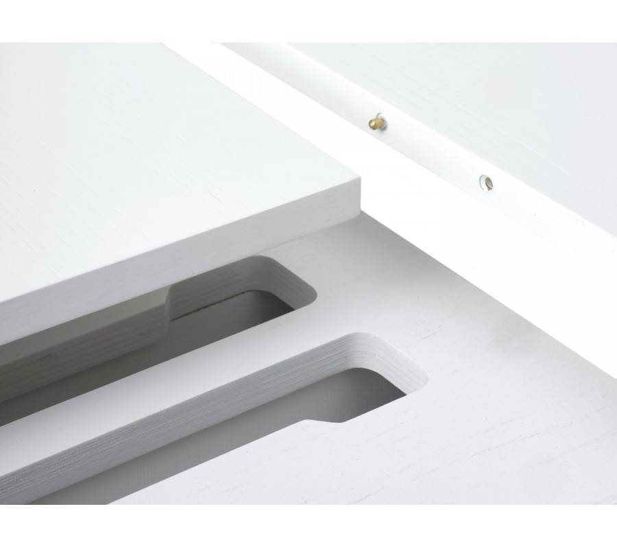 Stůl je vyroben z kombinace kvalitní dubové dýhy a MDF. Bílá povrchová úprava dodává stolu moderní charakter, přičemž jemně zvýrazňuje přirozenou strukturu dřeva a zachovává jeho přírodní vzhled.