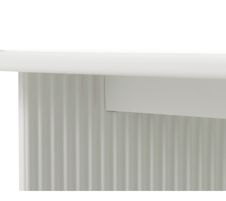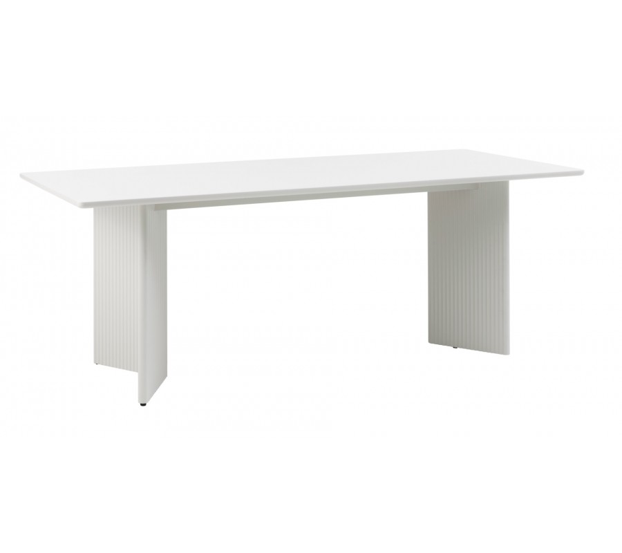 Stůl má hladkou obdélníkovou vrchní desku se zaoblenými rohy. S rozměrem 200x90 cm poskytne místo pro šest osob, přičemž design podstavy umožňuje pohodlné sezení u delších stran i za vrcholy stolu.Dvě nohy mají půdorys ve tvaru písmene V a jsou orientovány vrcholy k sobě. Zdobí je vertikální žebrování, inspirované art deco stylem.