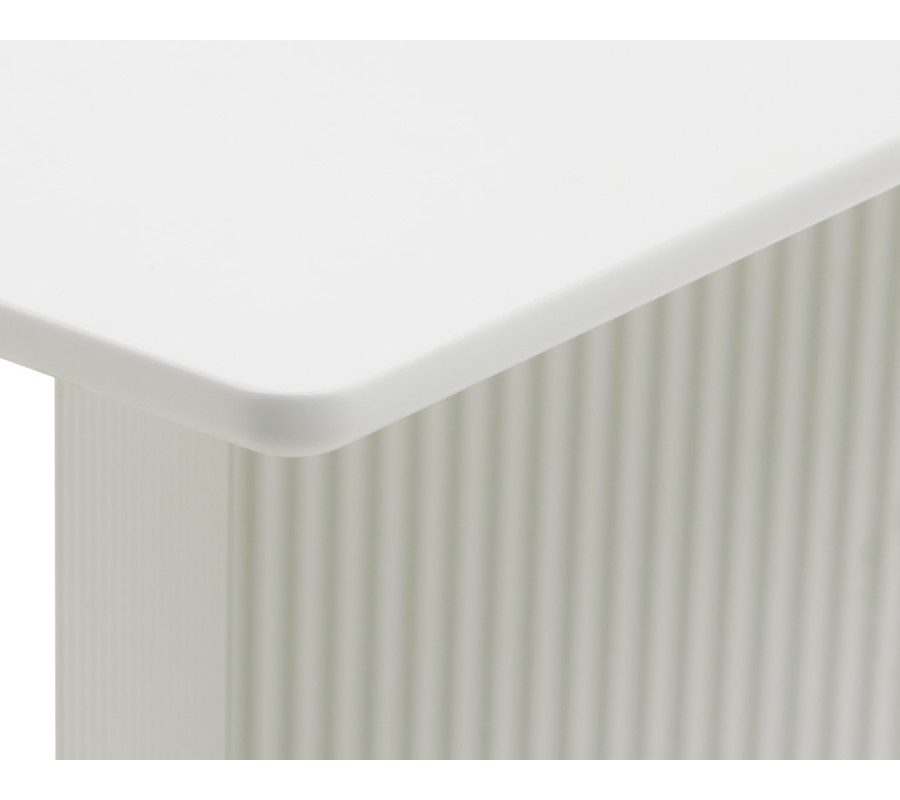 Stůl je vyroben z dýhovaného dřeva s povrchovou úpravou v elegantním odstínu greige. Kombinace šedých a béžových tónů působí čistým moderním dojmem a zdůrazňuje minimalistický vizuál.