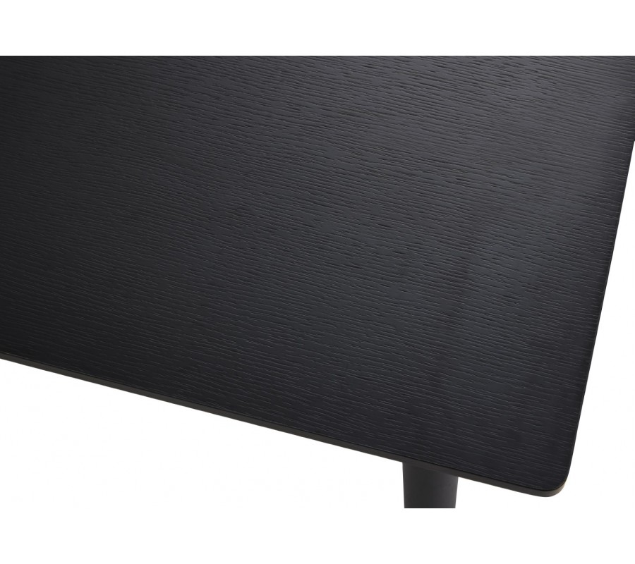 Stůl má moderní lineární siluetu s obdélníkovou vrchní deskou se zjemněnými zaoblenými rohy. Je vyrobena z MDF dýhy s melaminovou povrchovou úpravou, zaručující odolnost vůči vlhkosti. Provedení v černé barvě doplňuje dubový dekor s jemnou pravidelnou kresbou letokruhů, přinášející do designu teplý prvek. S rozměrem 140x85 cm poskytne stolovací místo pro čtyři osoby.