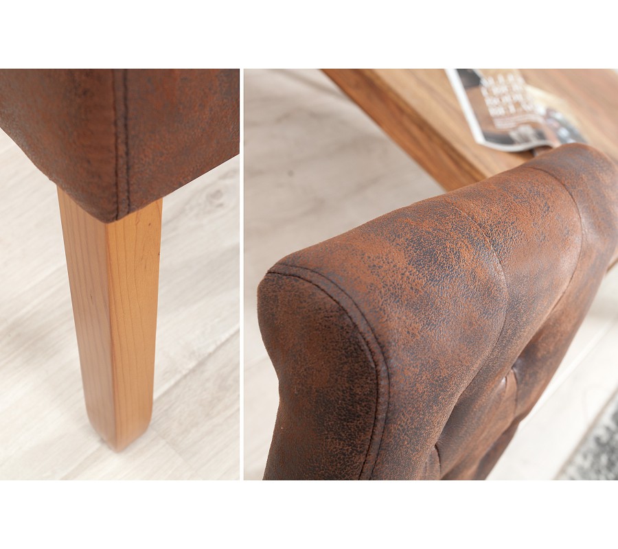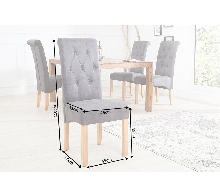 Ozdobné diamantové prošívání s knoflíky vytváří zajímavý textilní vzor, který umocňuje pocit luxusu. Masivní dřevěné nožičky v přírodní hnědé barvě jsou mírně zaoblené a zajišťují stabilitu. Sedadlo i opěradlo jsou čalouněné, což zaručuje pohodlné sezení i při delších večeřích. Praktický detail – potah má na zadní straně zádové opěrky zip, díky kterému je možné jej částečně odepnout nebo snadněji čistit.