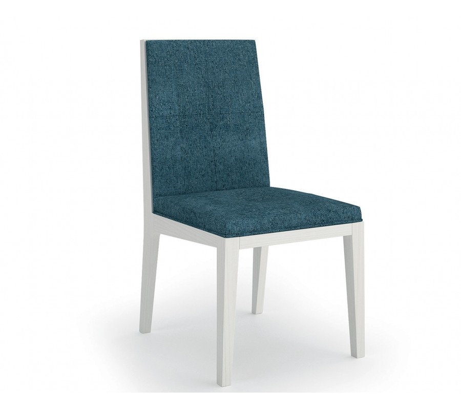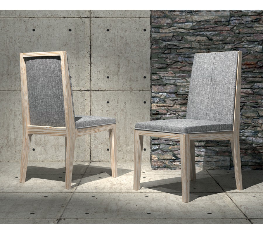 stolička má lineární moderní siluetu, kterou zdůrazňuje odhalená dřevěná konstrukce. Obdélníkový rám sedáku doplňují čtyři nožičky s hranatým profilem. Přední pár je rovný a zadní jemně zešikmený, což design tvarově oživuje a zároveň zajišťuje stabilní postavení. Zadní nožičky plynule přecházejí do obdélníkového rámu na zadní části zádové opěrky. Tento detail působí jako minimalistický dekorativní akcent, který podtrhuje čisté moderní linie. Sedadlo i zádová opěrka jsou čalouněné, s textilním potahem. Zádovou opěrku doplňuje zdobení v podobě prošívání, které ji vizuálně předěluje na čtyři stejné části.