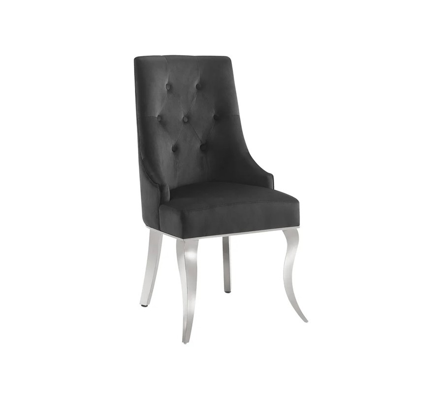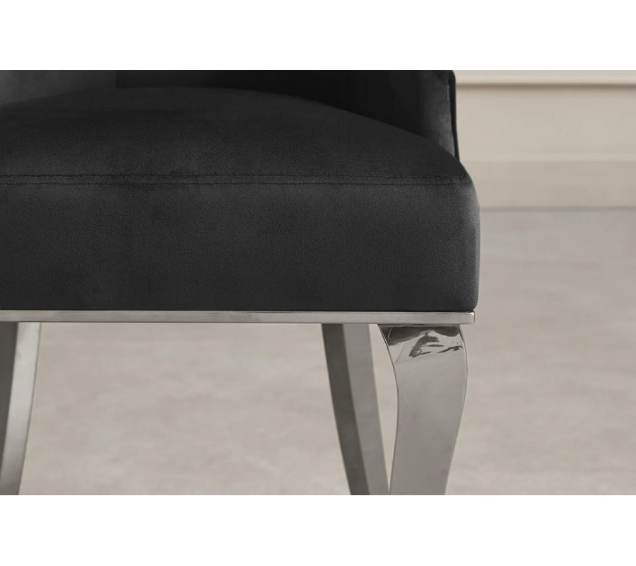 Židle je čalouněna v elegantním sametovém černém odstínu, který podtrhuje její noblesní charakter a umožňuje snadné kombinování s různými materiály a barvami interiéru. Kvalitní sametový potah z mikrovlákna je odolný, příjemný na dotek a spolu s precizním čalouněním zajišťuje komfortní sezení i při delších setkáních u jídelního stolu. Dekorativním detailem jsou prošívané knoflíky, které dodávají židli jemný barokní akcent a zvýrazňují její glamour charakter.