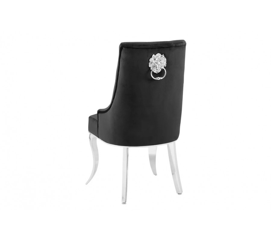 Praktické klopkadlo ve tvaru lvové hlavy umístěné na zadní straně opěradla slouží pro snadnou manipulaci se židlí a zároveň plní dekorativní funkci typickou pro glamour a barokní styl. Model je řešen bez opěrek na ruce, což umožňuje praktické zasunutí židle pod stůl. Bohatě čalouněná sedací část zajišťuje příjemné a stabilní sezení, zatímco židle si zachovává lehký a vyvážený vzhled.