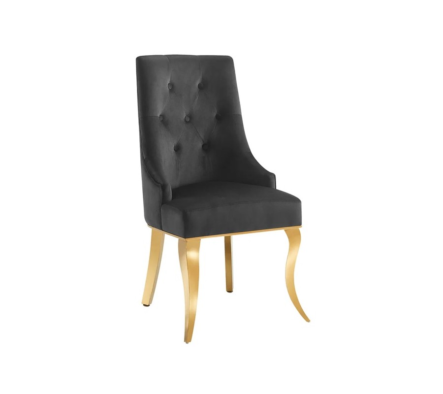 Kvalitní černý sametový potah z odolného mikrovlákna je příjemný na dotek a spolu s bohatou výplní poskytuje vysoký komfort při sezení. Opěradlo je zdobeno dekorativním prošíváním s knoflíky, které dodávají židli typický barokní akcent a luxusní vzhled.