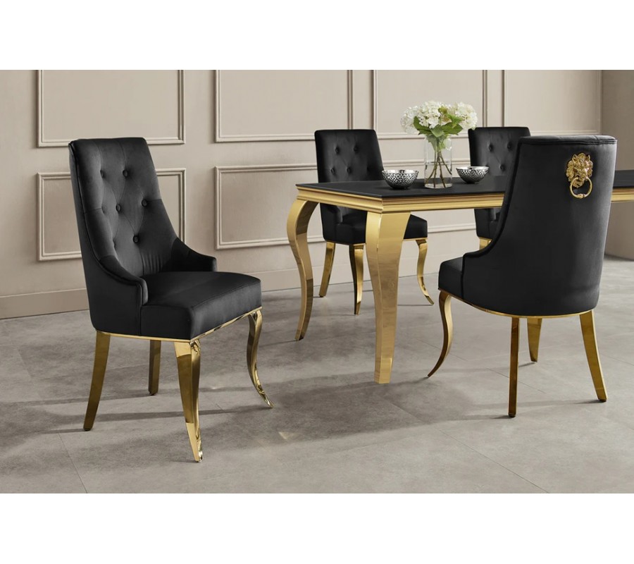 Designová glamour jídelní židle Gold Barock s kabriolovýma nohama ve zlaté barvě a černým sametovým potahem 100 cm