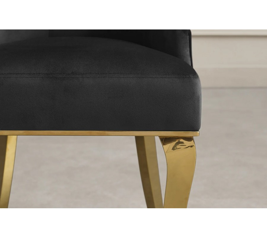 Dominantním designovým prvkem jsou kabriolové nožičky z nerezavějící oceli ve zlatém provedení. Jejich elegantně prohnutý barokní tvar dodává židli noblesu a dekorativní charakter, zatímco pevná kovová konstrukce zaručuje stabilitu, odolnost a dlouhou životnost. Lesklý zlatý povrch zvýrazňuje glamour efekt a dodává židli luxusní akcent.