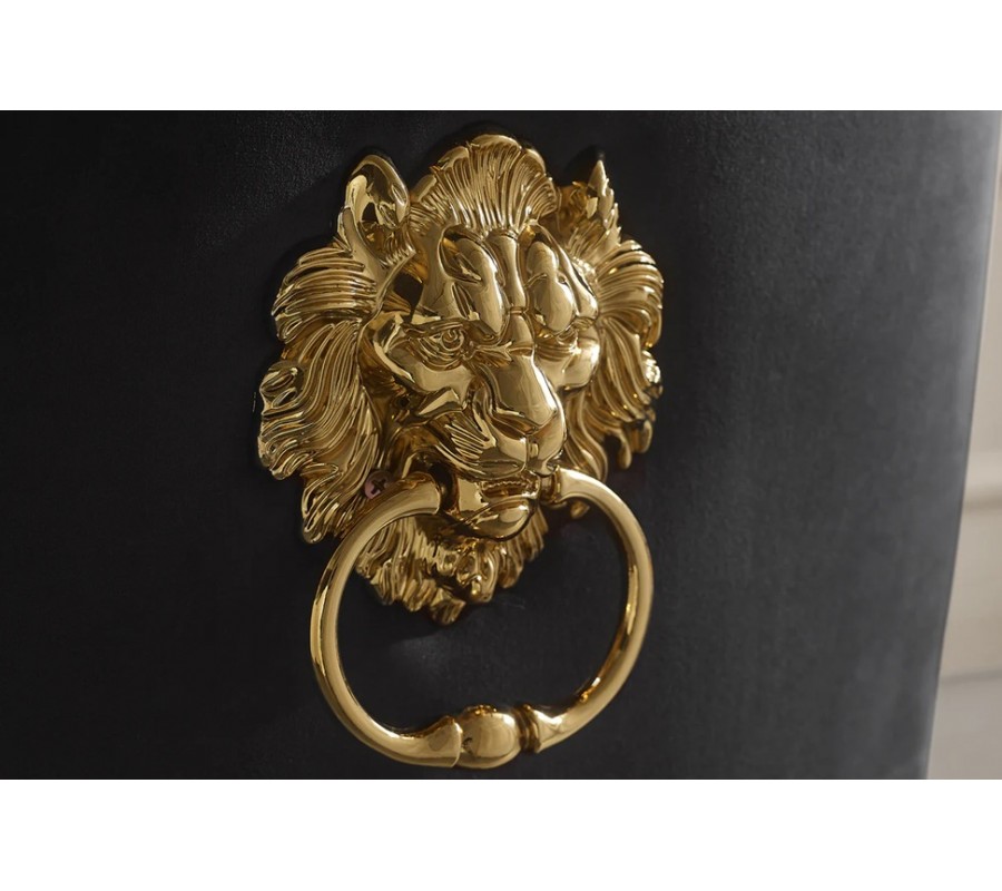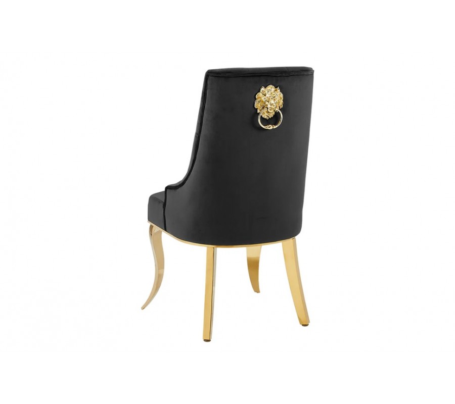 Na zadní straně opěradla se nachází výrazné dekorativní klepadlo ve tvaru lví hlavy zlaté barvy, které slouží pro snadnou manipulaci se židlí a zároveň funguje jako výrazný designový detail typický pro barokní a glamour styl.