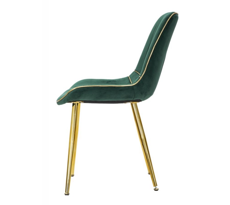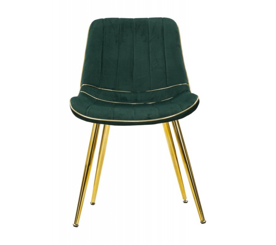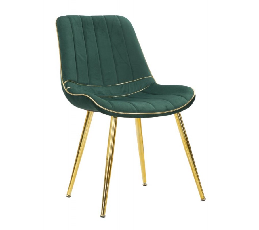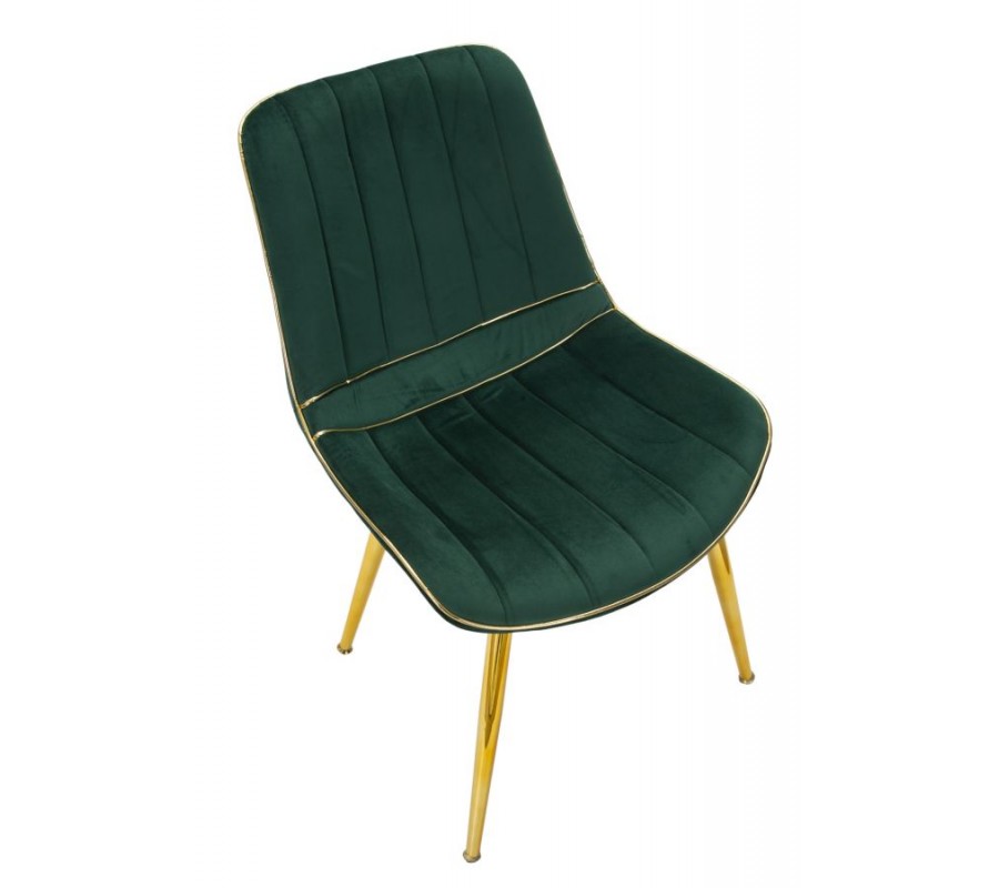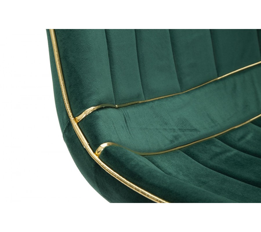 Zlaté detaily lemují obvod sedací části i spodní část opěradla, přičemž vytvářejí rafinovaný kontrast se zeleným čalouněním. Tento precizně zpracovaný lem podtrhuje elegantní siluetu židle a dodává jí exkluzivní nádech.