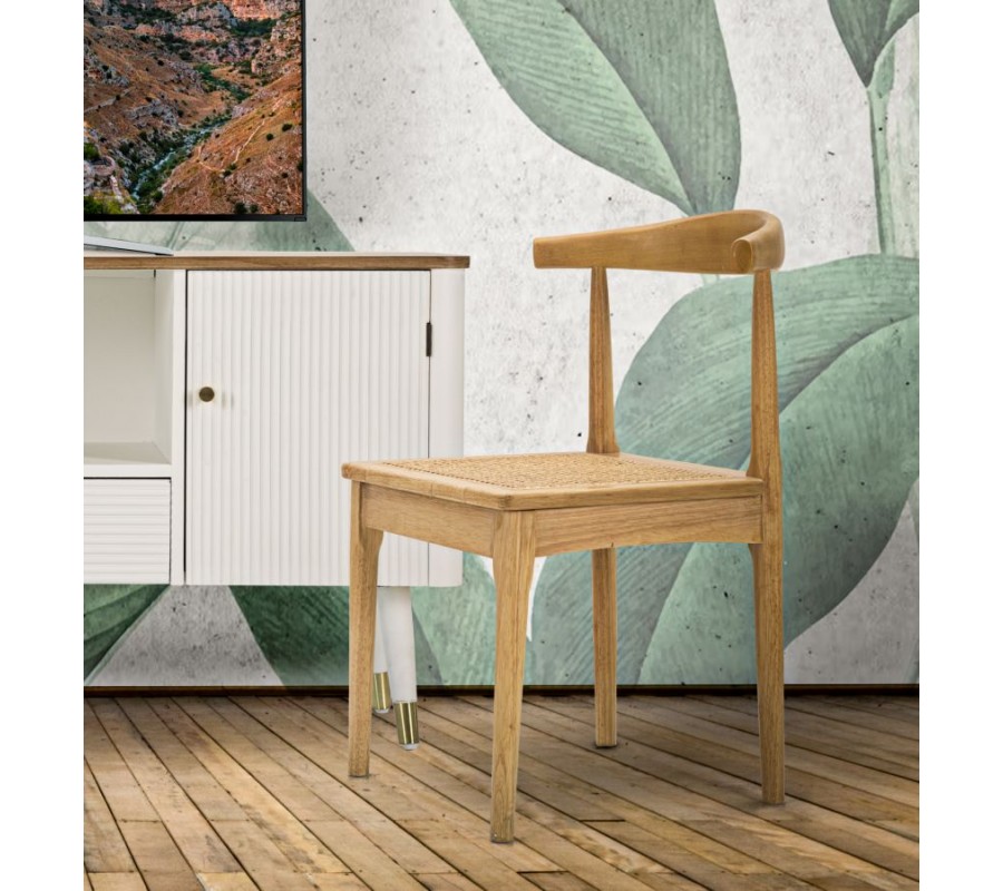 Jídelní židle Noelle v přírodních hnědých odstínech je vyrobena z masivního kaučukového dřeva, které se vyznačuje vysokou pevností a jemnou texturou. Povrchová úprava zachovává přirozenou strukturu dřeva, čímž dodává židli řemeslný charakter, který je typický pro venkovský styl.