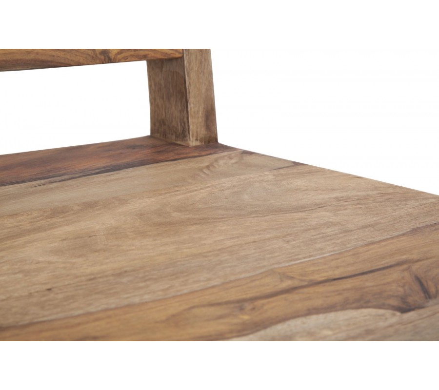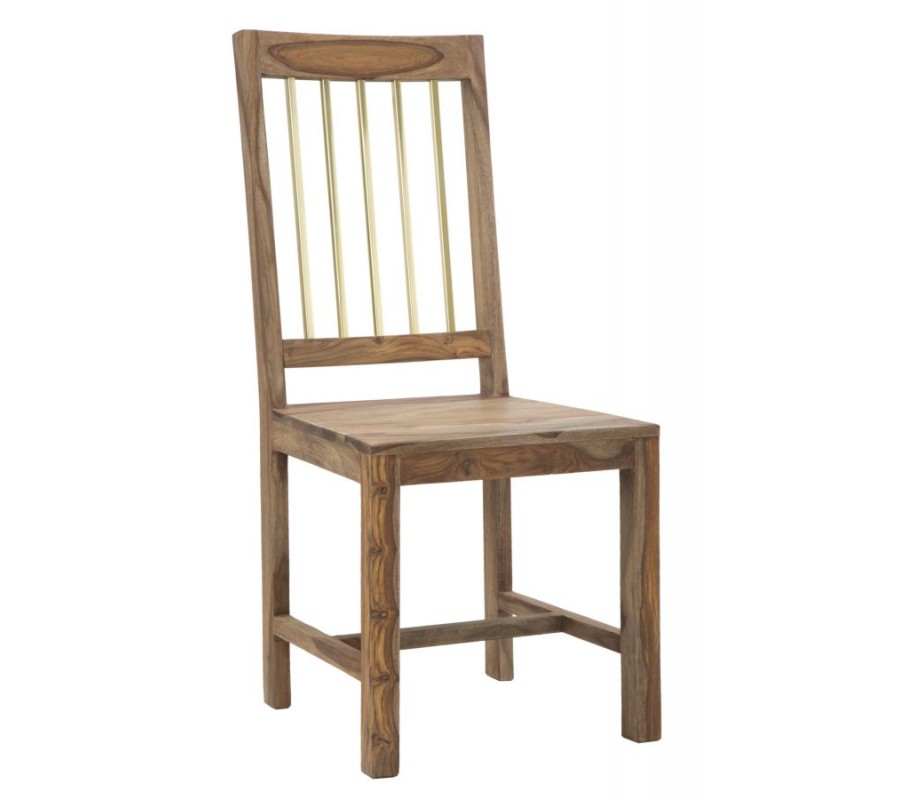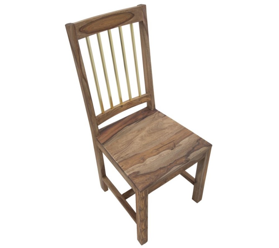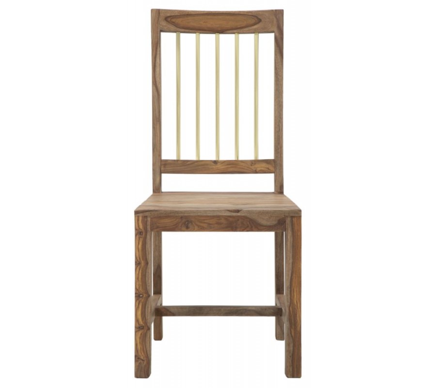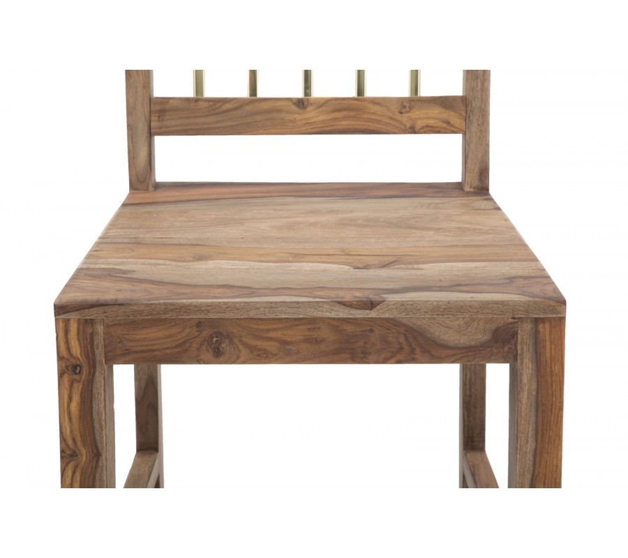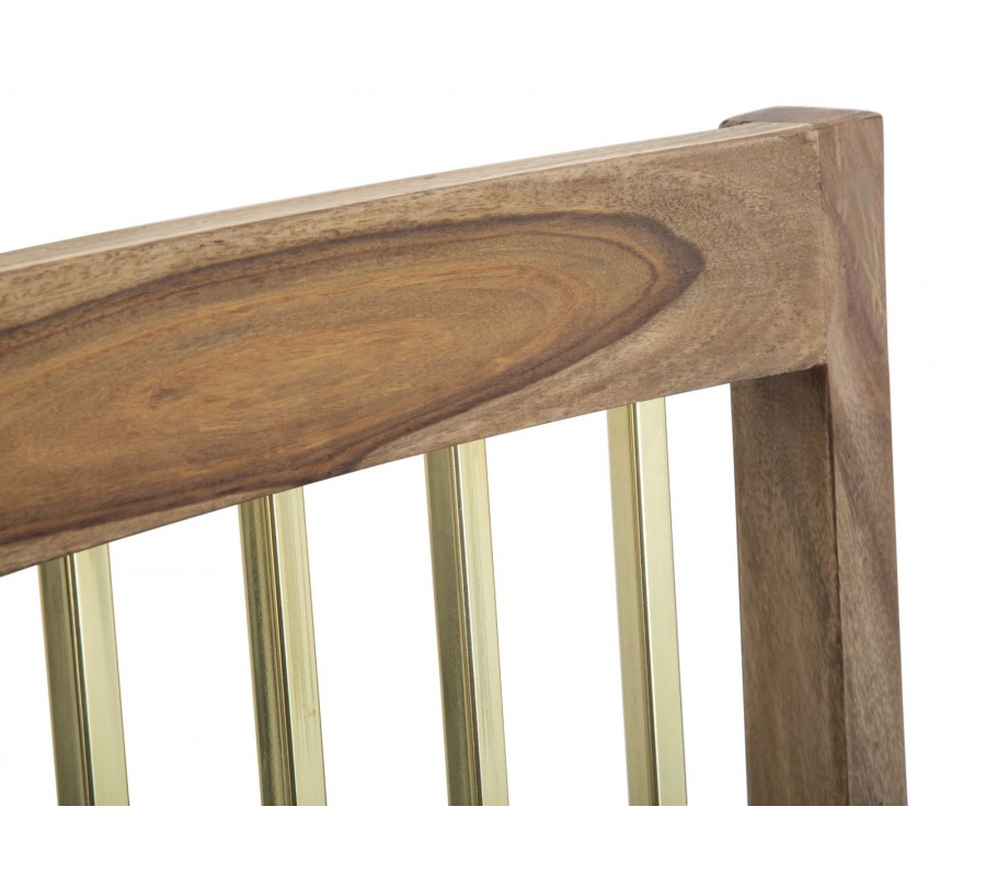 Zlatá barva detailu opěrky výborně koresponduje s bohatým a teplým hnědým odstínem sheeshamového dřeva. Kromě krásné barvy se vyznačuje také expresivní kresbou letokruhů, která zdobí hladké povrchy a dodává židli výrazný naturální charakter.