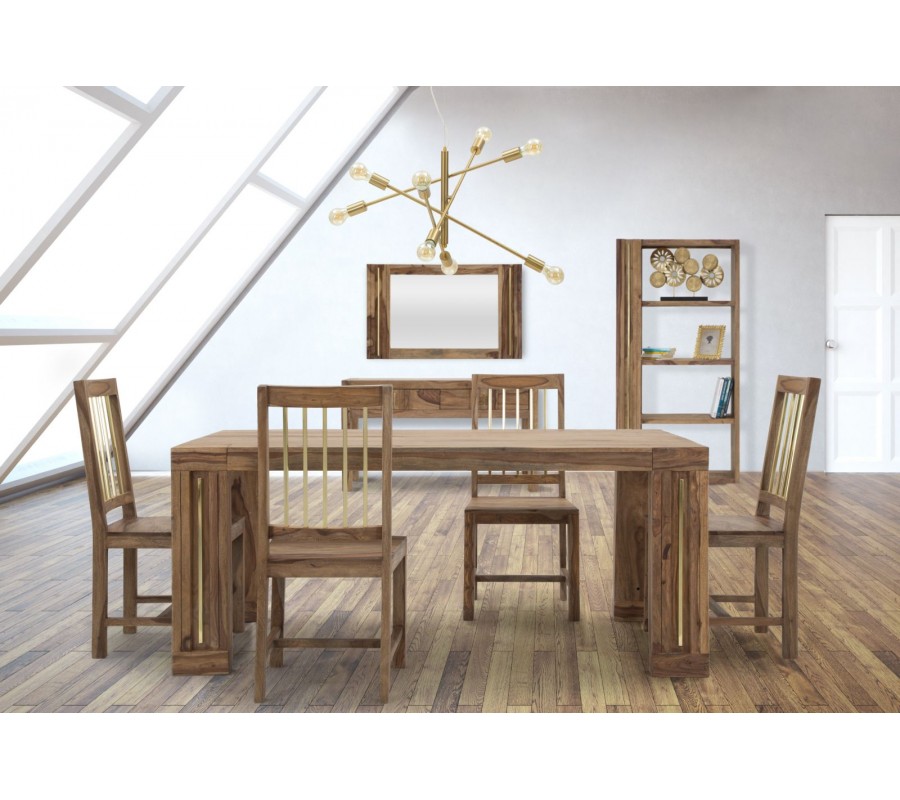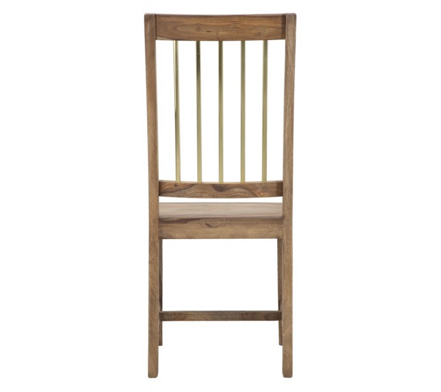 Jídelní židle Saanvi spojuje tradiční siluetu se stylovým kontrastním akcentem ve zlaté barvě. Do prostoru přinese originální designový prvek a útulný teplý vizuál masivního dřeva.