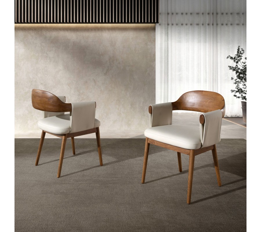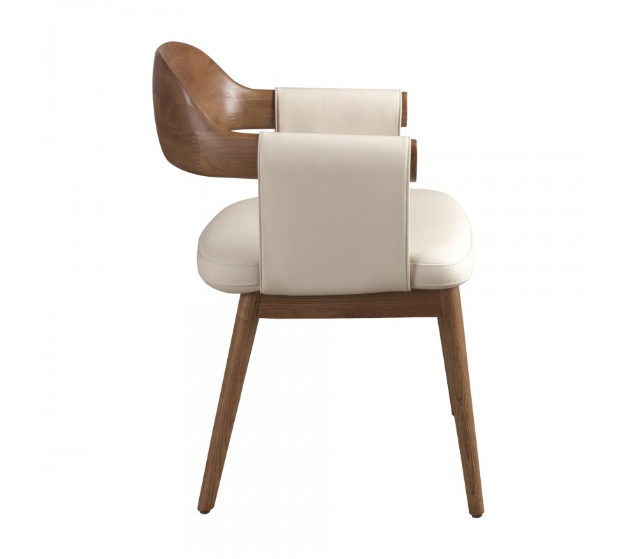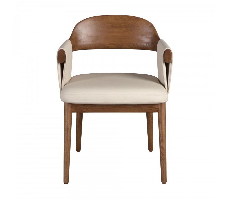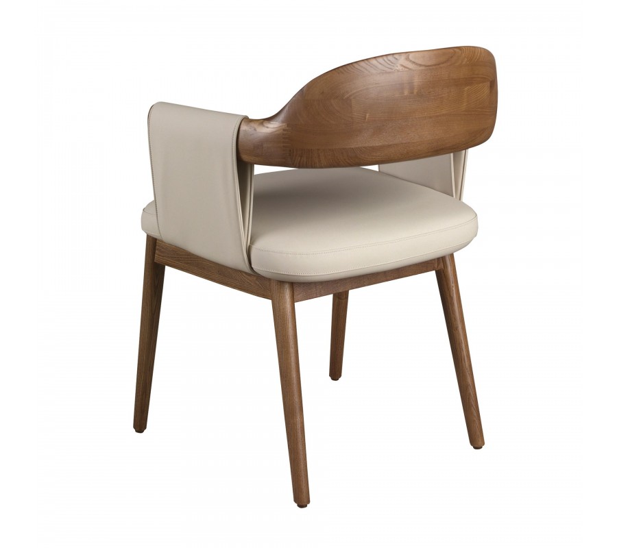Konstrukce židle je vyrobena z masivního dřeva, lakovaného v bohatém ořechovém hnědém odstínu. Přiznaná kresba letokruhů a naturální provedení přinášejí do moderního designu dotek přírodní harmonie. Teplé tóny dřeva krásně korespondují s krémovou béžovou barvou potahu z ekokůže, který má hladký a na dotek příjemný povrch.